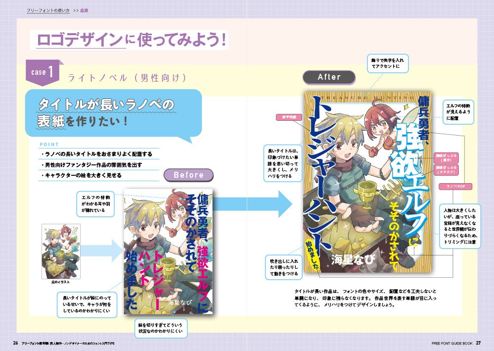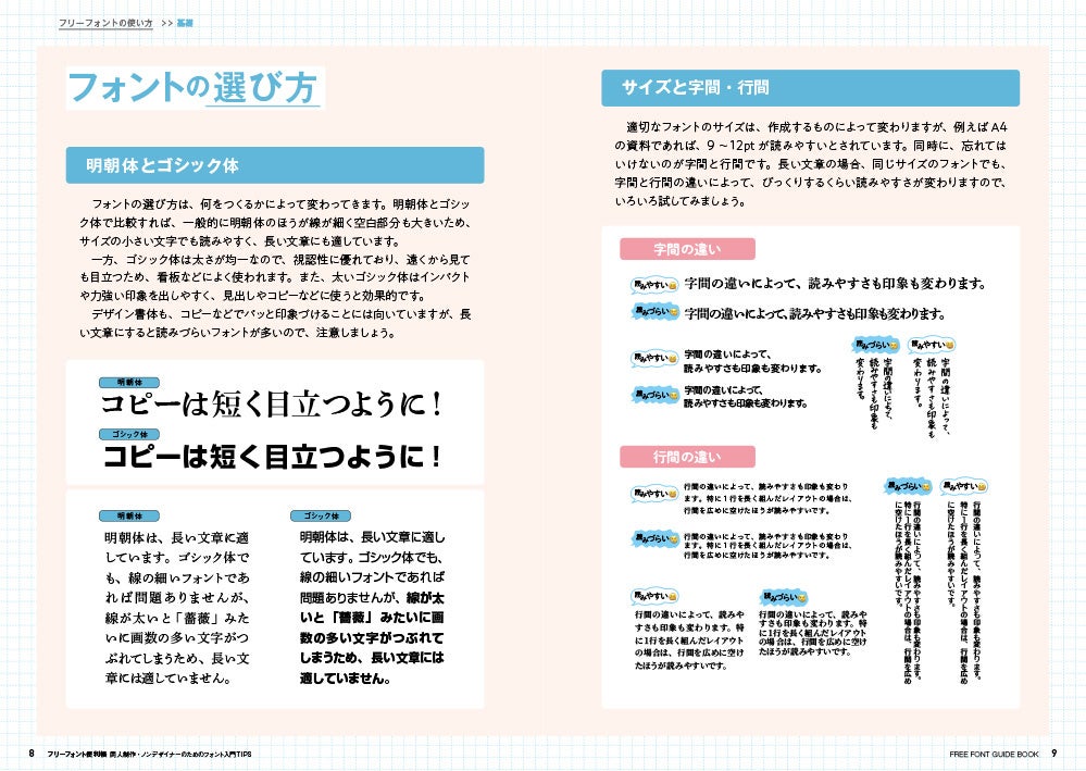 解説ページ「基礎編」では、フォントの構造やインストール方法、混植や合成フォントなど、初心者向けに全体的な解説を行っています。また、解説ページ「応用編」では、組見本を用いた本文向けフォントの比較、セリフで感情を表現するためのフォント選び、表紙やロゴのデザイン作例を紹介しています。