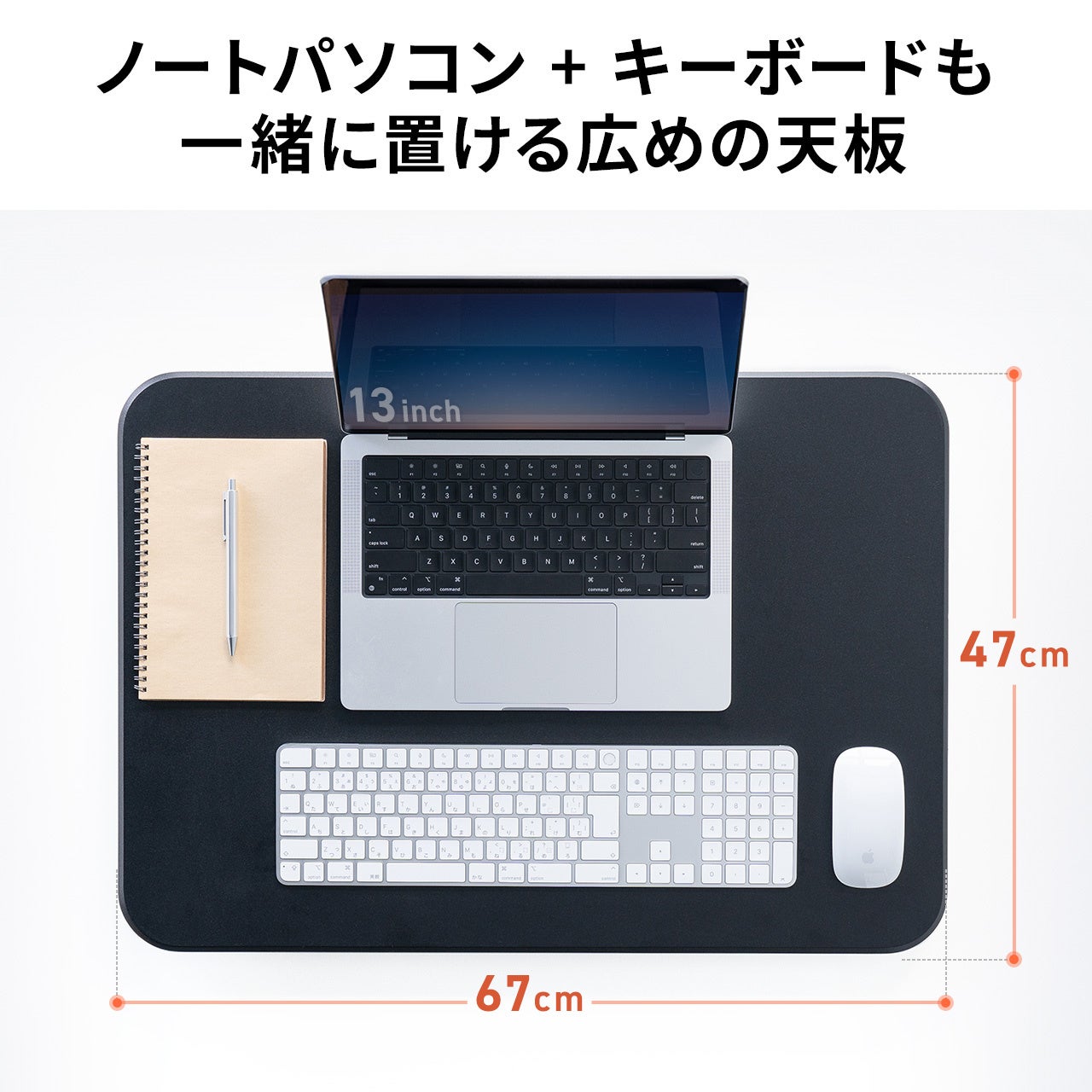 ノートパソコンにキーボードを置いてもゆとりある広めのフラット天板が魅力。資料を広げたり、タブレットを置いたりと、さまざまな使い方が可能です。