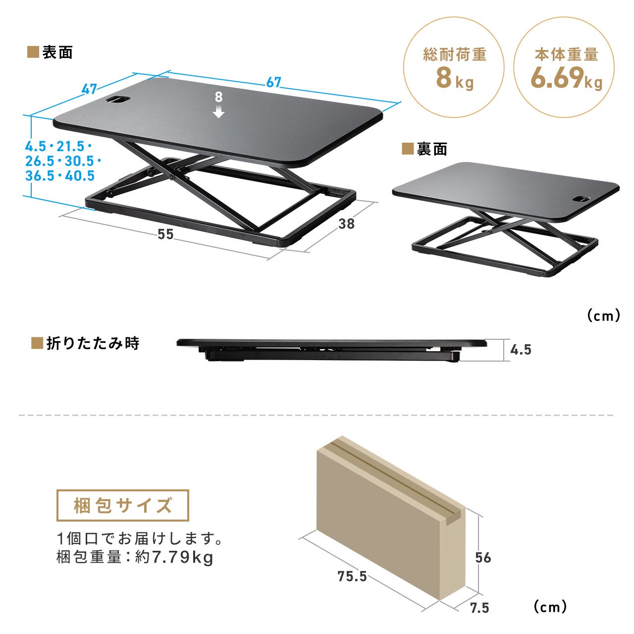 スタンディングデスク リフトアップデスク 卓上 バネ圧昇降 幅67cm モニターアーム取付対応 高さ調整4.5~40.5cm 作業台