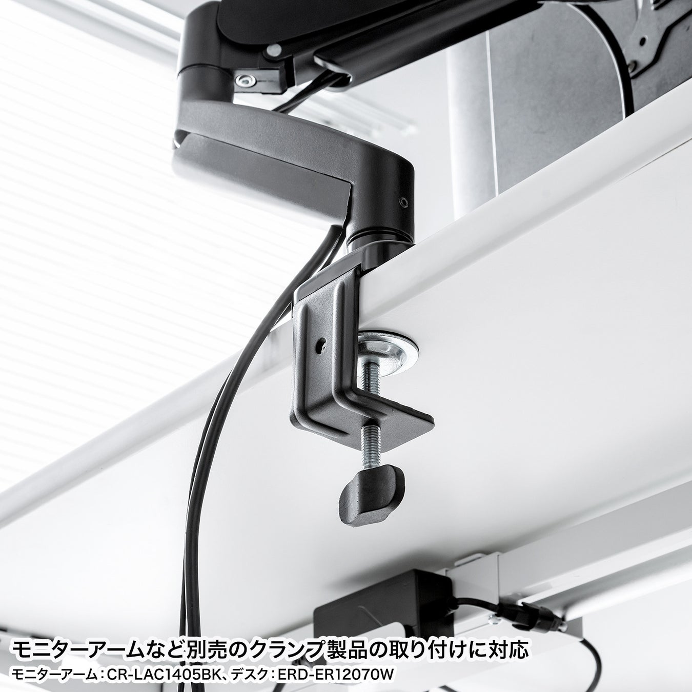 モニターアームのクランプ取り付けに際して、後面が広く開いているので干渉物を気にすることなく取り付けができます。また、天板後部にねじ穴を装備しており、煩雑になりがちなケーブルを収納できるケーブルトレーを専用品のように取り付けることができます。
