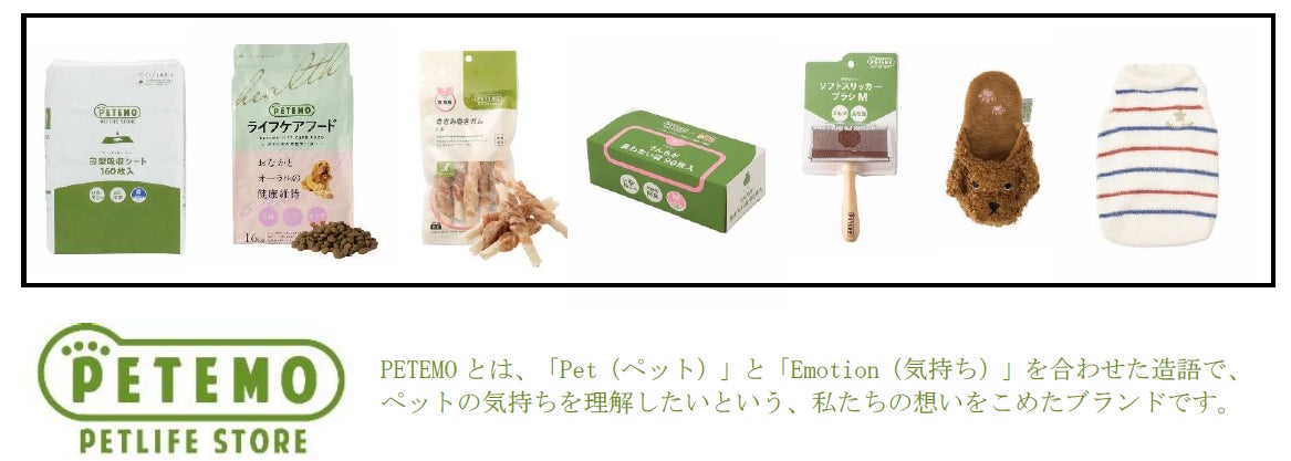 ペットライフの多様化やペットの健康志向が加速し、ペットに少しでも良いものをあげたい、 ペットとの生活をより快適で健康的にしたい、というお客さまの意識が高まっています。こうした中当店では、お客さまのニーズにより一層お応えできる商品のご提供を目的に、ストアブランド「PETEMO」の商品を豊富に取り揃えます。当ブランドでは、「ちょっといいものを、今日もあしたも。」を商品ブランドコンセプトとし、お客さまに毎日お使いいただけるよう、高品質とお手頃価格にこだわります。