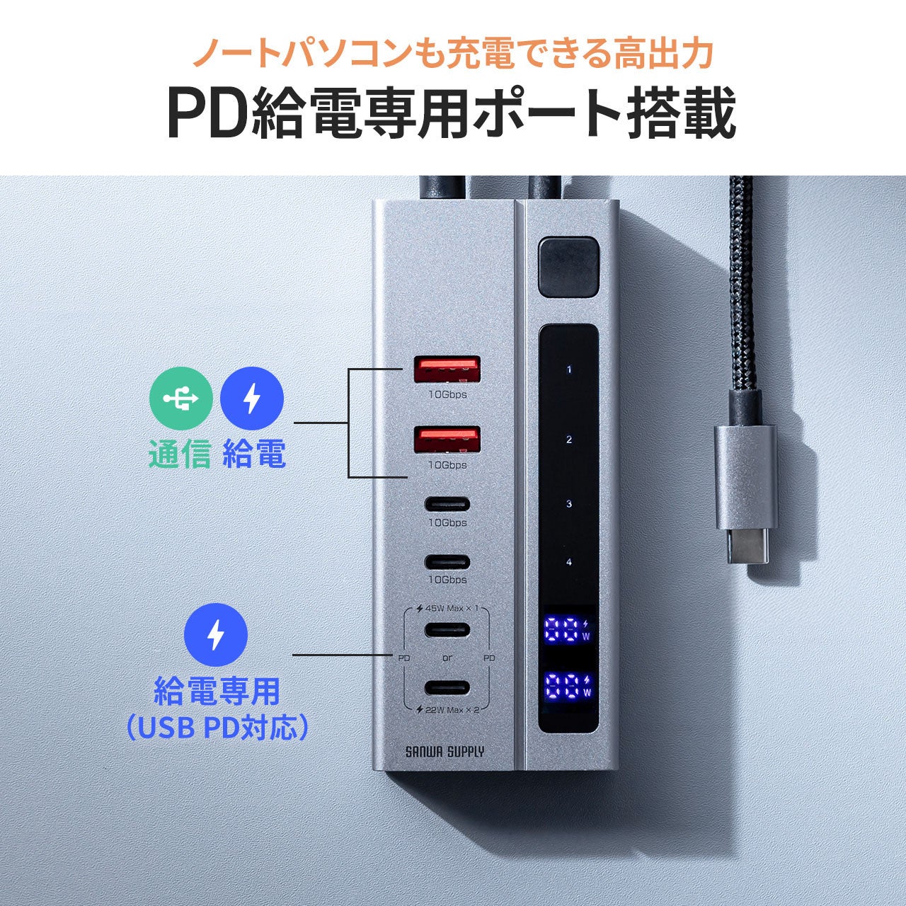 USBハブ 4ポート PD専用ポート 2ポート USB充電器 Type-C セルフパワー 最大PD45W対応 ディスプレイ付き USB3.2 Gen2 USB 10Gbps 400-HUBC35GM