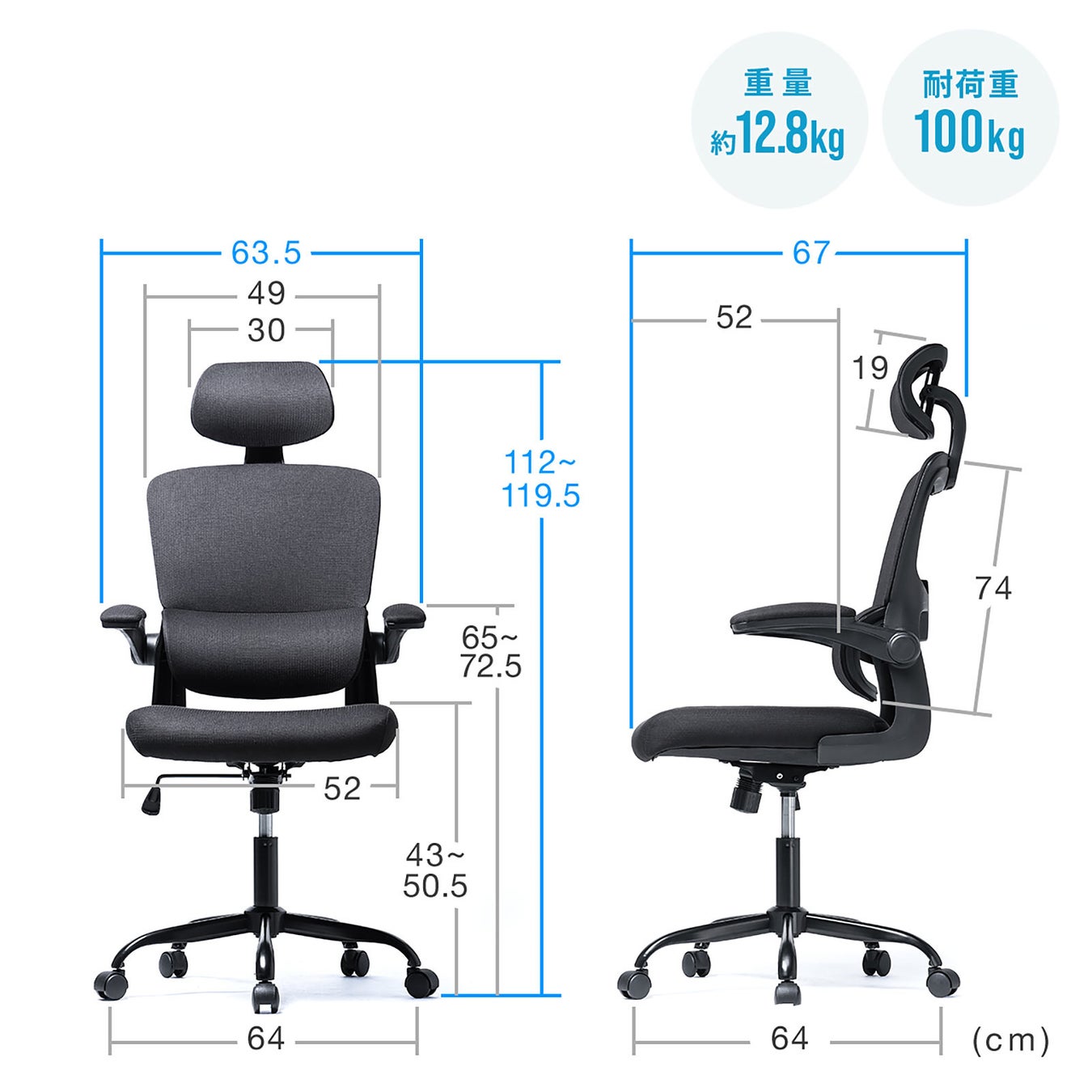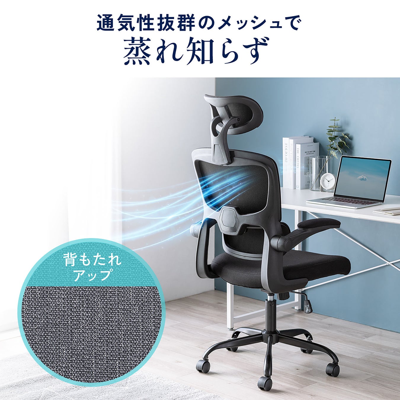 通気性抜群のメッシュ生地採用。跳ね上げ式アームレストも使用した耐荷重100kgのチェア。