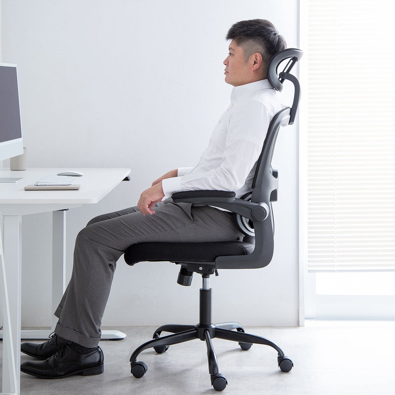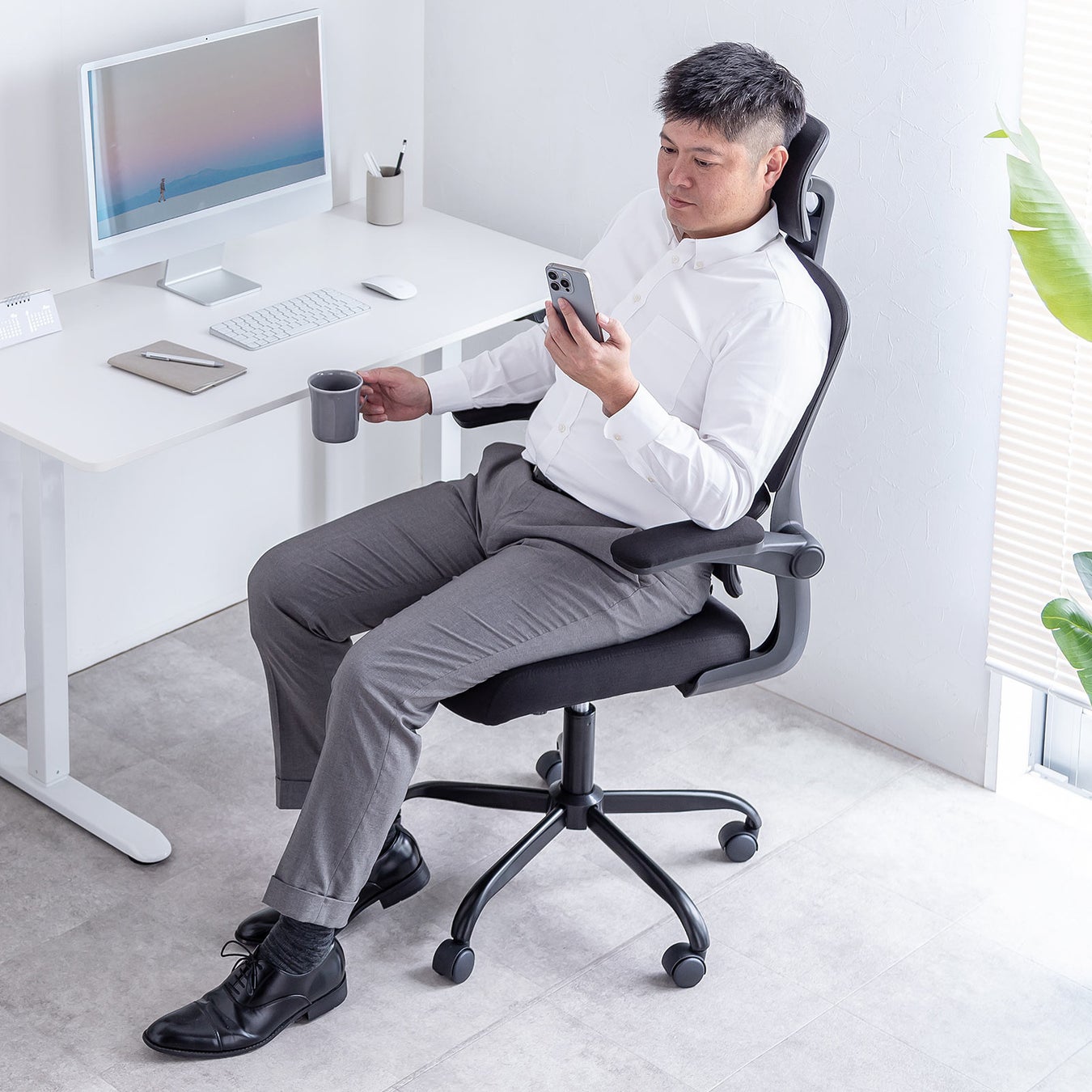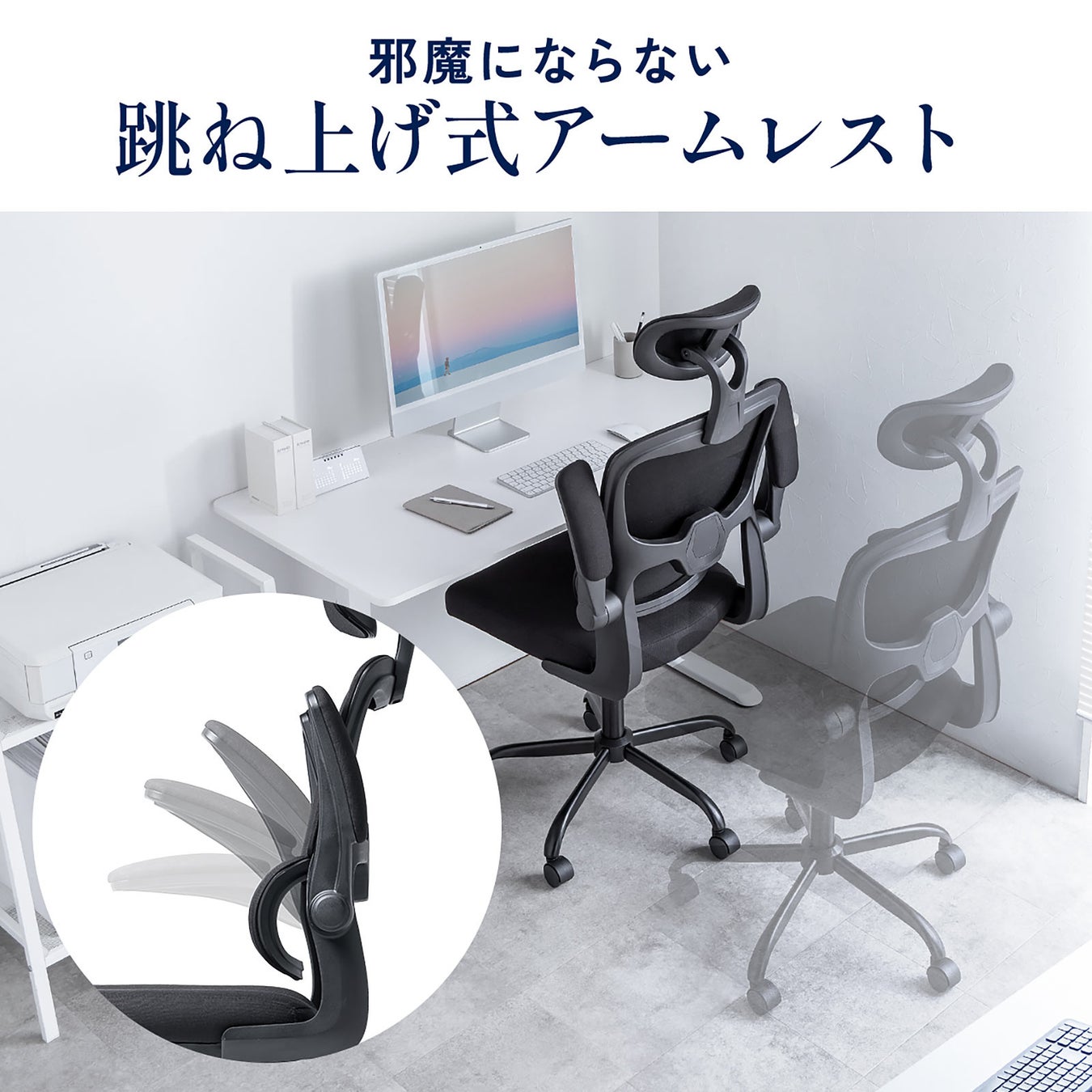 跳ね上げ式アームレストは、必要なときだけ使える便利な設計。使わないときはスムーズに収納でき、狭いスペースでも邪魔になりません。デスク周りの自由度が広がり、作業効率が向上します。