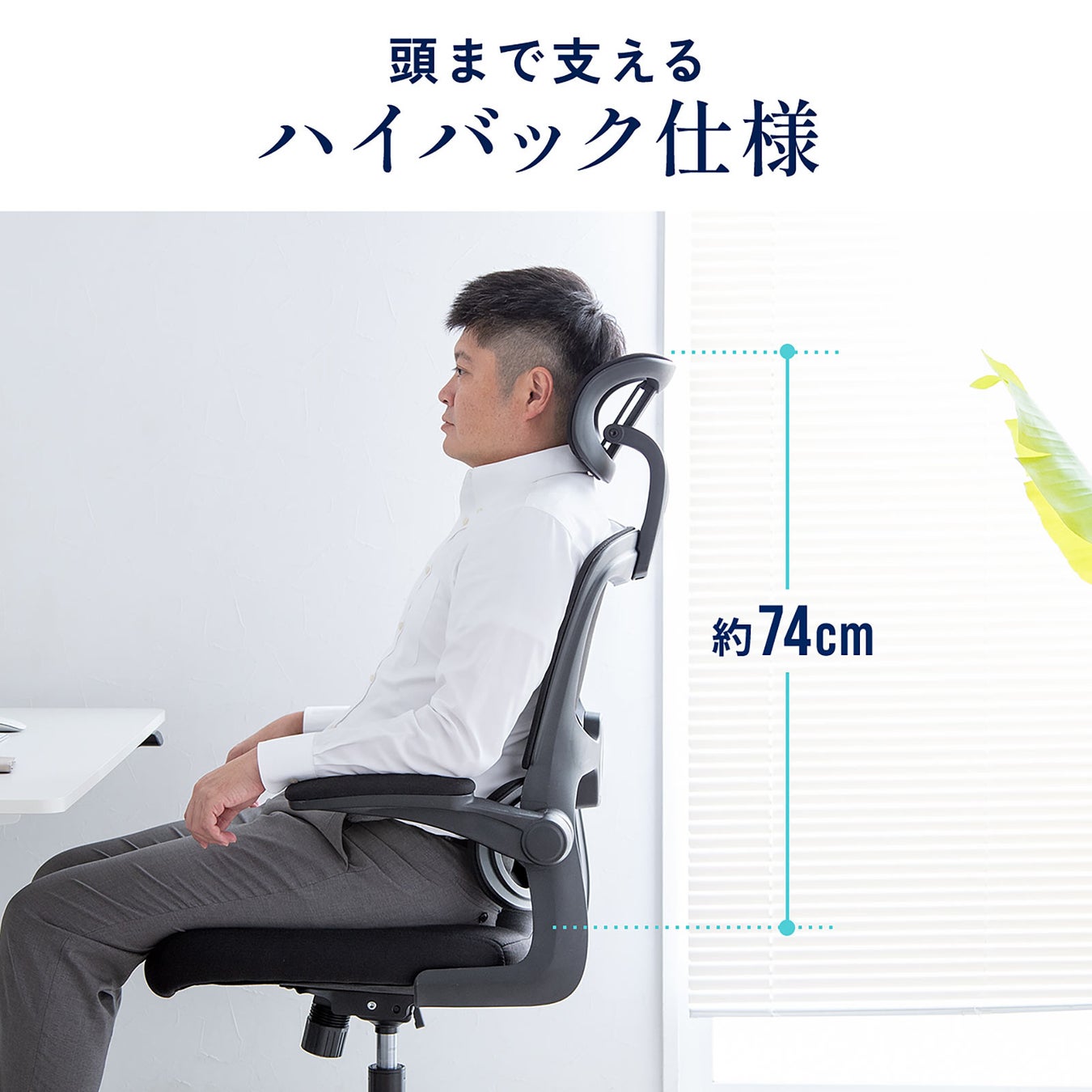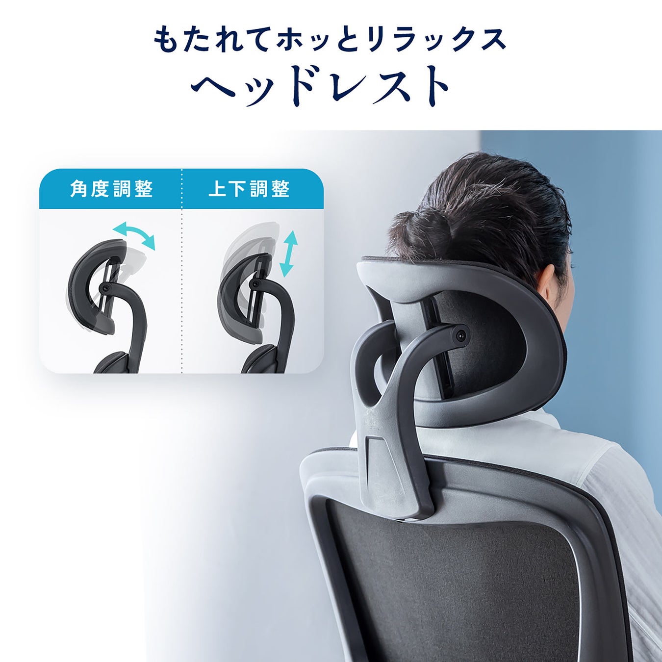 上下可動角度調節可能ヘッドレストも備えているので、好みに応じて最適な姿勢を作り出せます。これにより、長時間の作業でも快適さを維持します。