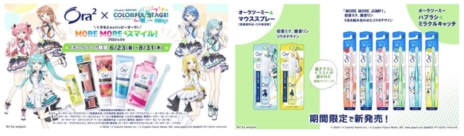 6月23日(金)より、サンスター オーラツーと「MORE MORE JUMP !」とのコラボレーションとなる「くちもとからハッピーオーラ! MORE MORE スマイル!プロジェクト」の実施が決定いたしました。「MORE MORE JUMP !」のメンバーとバーチャル・シンガーの初音ミク、鏡音リンがデザインされたマウススプレーやハブラシなどのコラボ商品が、期間限定で販売される予定です。