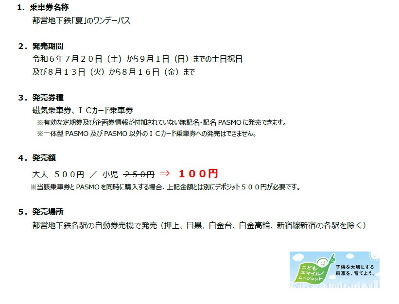 東京都交通局では、お子様連れで外出しやすい環境づくりに向け、都営地下鉄が土日祝日に一日乗り放題となる都営地下鉄「夏」のワンデーパスについて、子どもの発売金額を通常250円のところ100円で発売いたします。また、これまで発売期間は土日祝日のみでしたが、お盆期間の平日にも拡大します。
