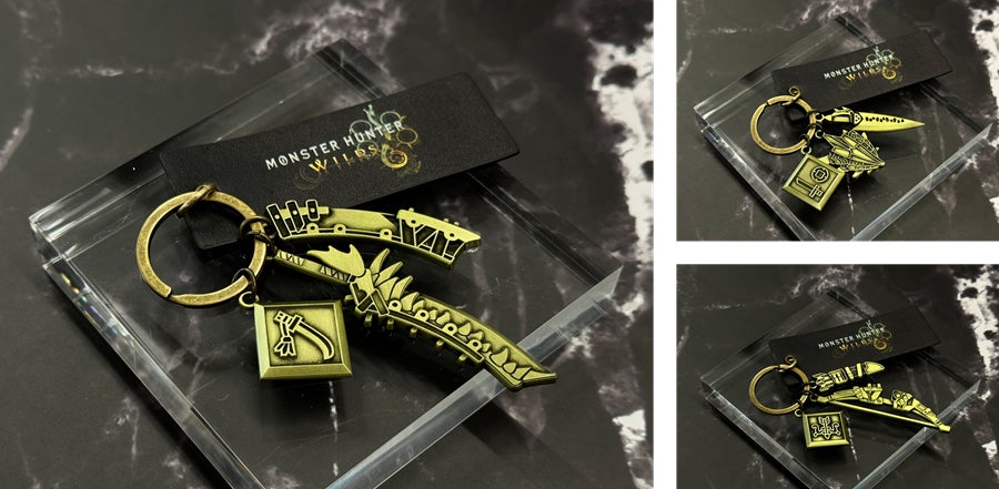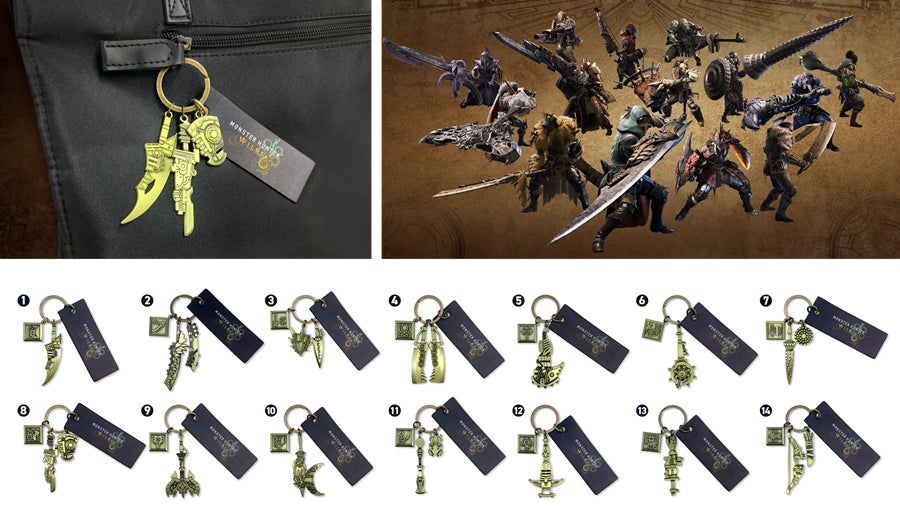 『モンスターハンターワイルズ』に登場する全武器種より、14種が重厚感あるキーチャームになりました。味わい深い印象を受けるいぶし金は、武器種アイコンやロゴ入りの合皮タグも併せてあしらっており、自分自身のオリジナルスタイルで他の武器と組み合わせることも可能です。重厚感あふれるアイテムとなっておりますので、ぜひお気に入りの武器をバッグに装備するなどしてお楽しみください。