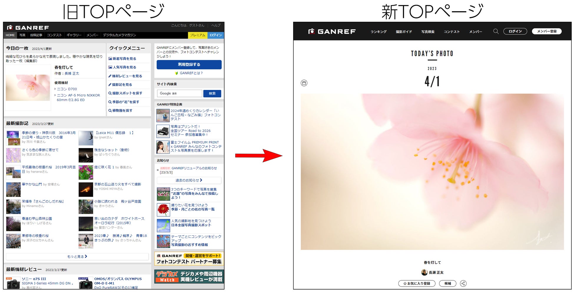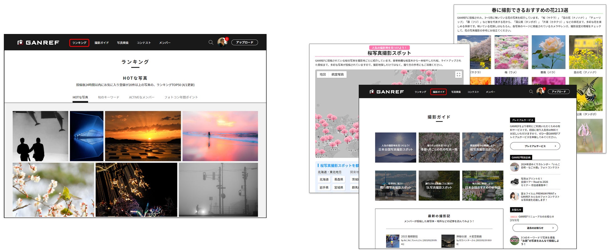 「探す楽しさ、見せる喜び、集うトキメキ」をテーマに、デジタルカメラユーザーの創作活動と機材選びをサポートする「GANREF」は、2009年のサービス開始以来、会員同士の活発なコミュニケーションに支えられ、登録者数が5万人(2023年4月現在)を突破しました。近年の傾向としてスマートフォンやタブレット、高解像ディスプレイ等でのサイト利用が増える中、基本的な機能はそのままにデザインやユーザーインターフェイスを刷新することで、さらに快適に写真を楽しめるサイトへと生まれ変わりました。