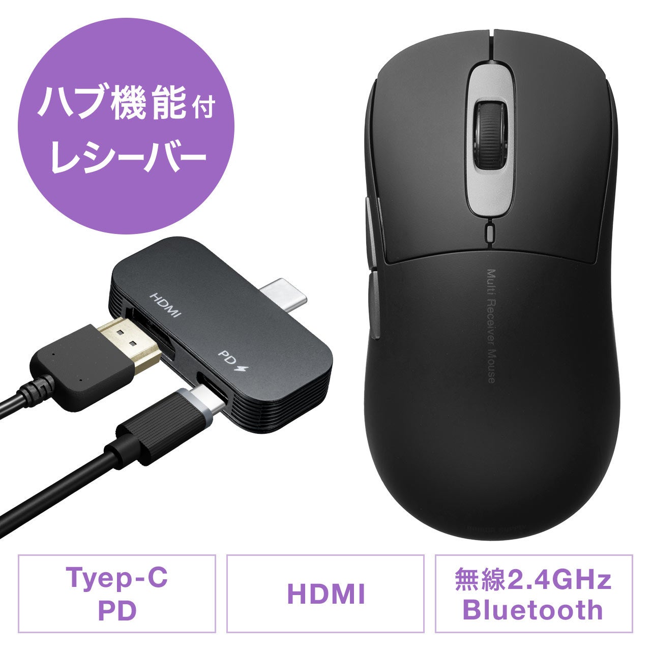 本製品はモバイルワークに革新をもたらすUSB-Cハブ一体型レシーバー付属のワイヤレスマウスです。レシーバーには4K/60Hz対応のHDMIポートと最大100Wの入力に対応したPD入力ポートを搭載。