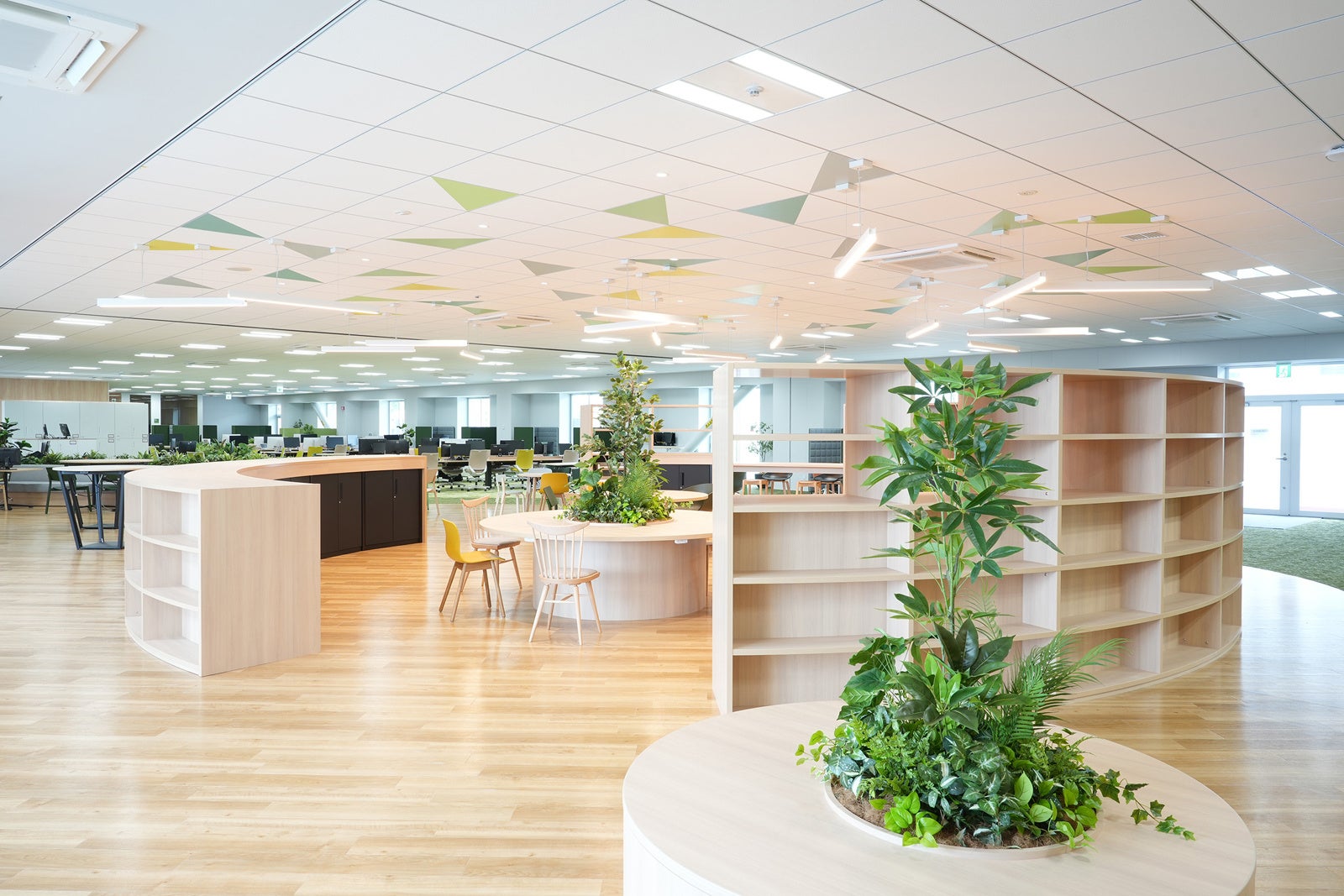 草津新棟は、「心と体の健やかさを大切に、従業員同士のコラボレーションを促し、みんなで育てる実証実験の場」をコンセプトに、フリーアドレスのオフィスエリアや様々な部門の社員が集まり、意見の交換やアイデアの共有を行えるコミュニケーションスペースを設けています。また、自然と調和したデザインや、執務環境に適した光・温熱環境を実現すると共に、次亜塩素酸技術による高い除菌・脱臭力を特長とする天井埋込形ジアイーノなど空質空調社空質製品も設置することで、安心・安全な業務空間を提供し、社員が働きやすいオフィスを実現しています。