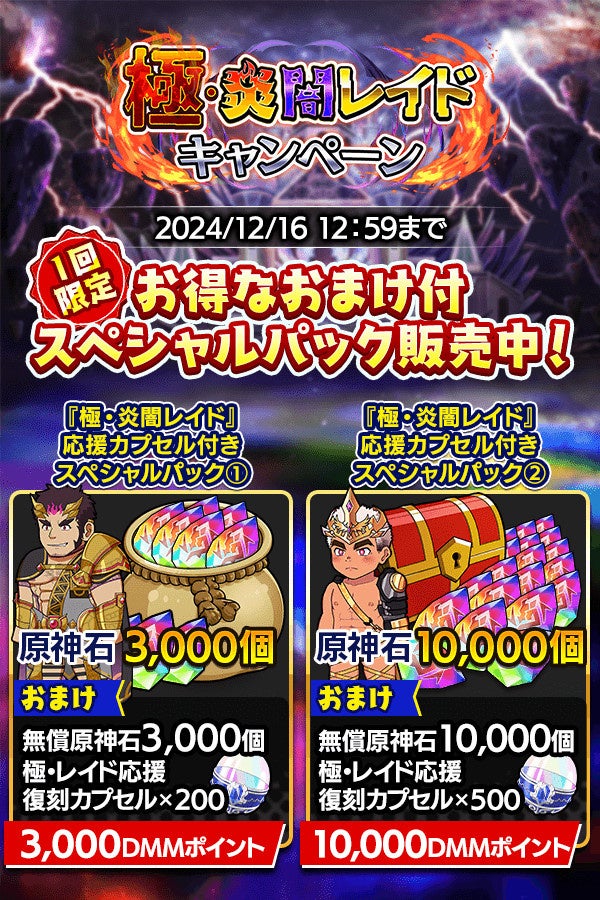また、原神石がおトクに入手できる「極・炎闇レイドキャンペーンスペシャルパック」も同時に登場!