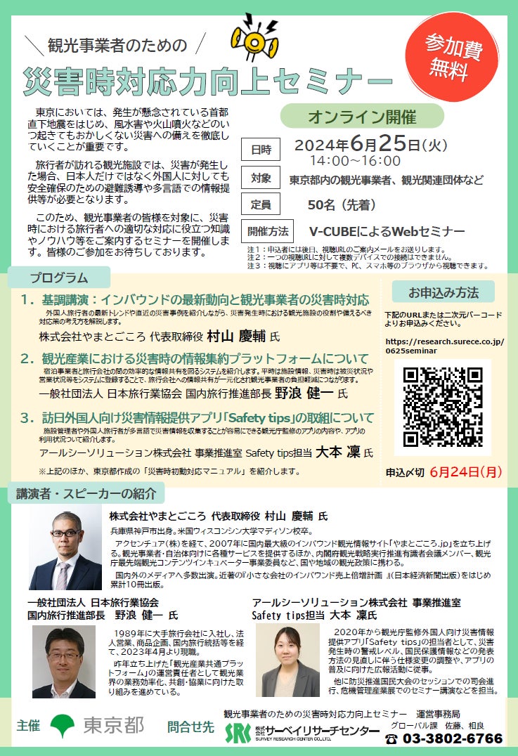 このため、観光事業者の皆様を対象に、災害時における旅行者への適切な対応に役立つ知識やノウハウ等をご案内するセミナーを開催します。皆様のご参加をお待ちしております。