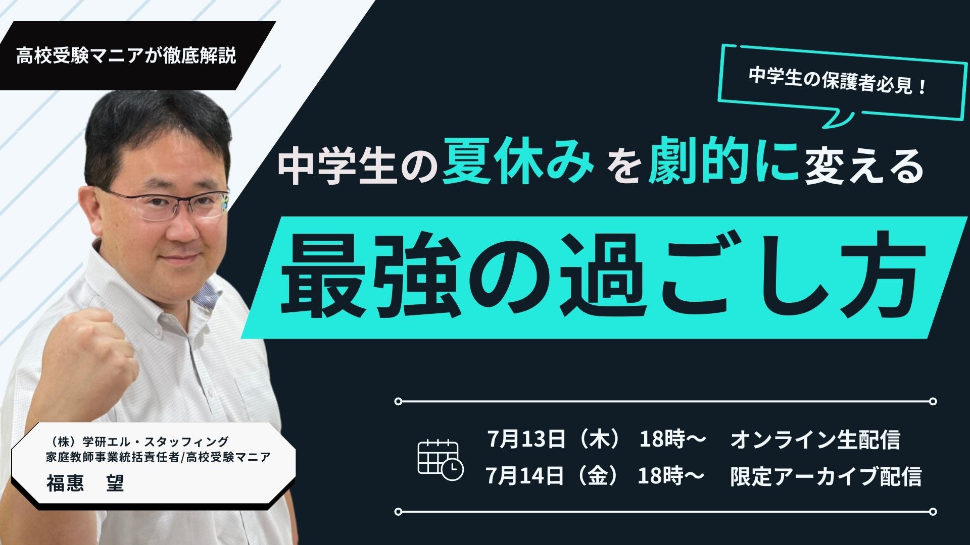 学研の家庭教師が、「【中学生の保護者必見!】中学生の夏休みを劇的に変える最強の過ごし方セミナー」を7月13日(木)、7月14日(金)に開催します!