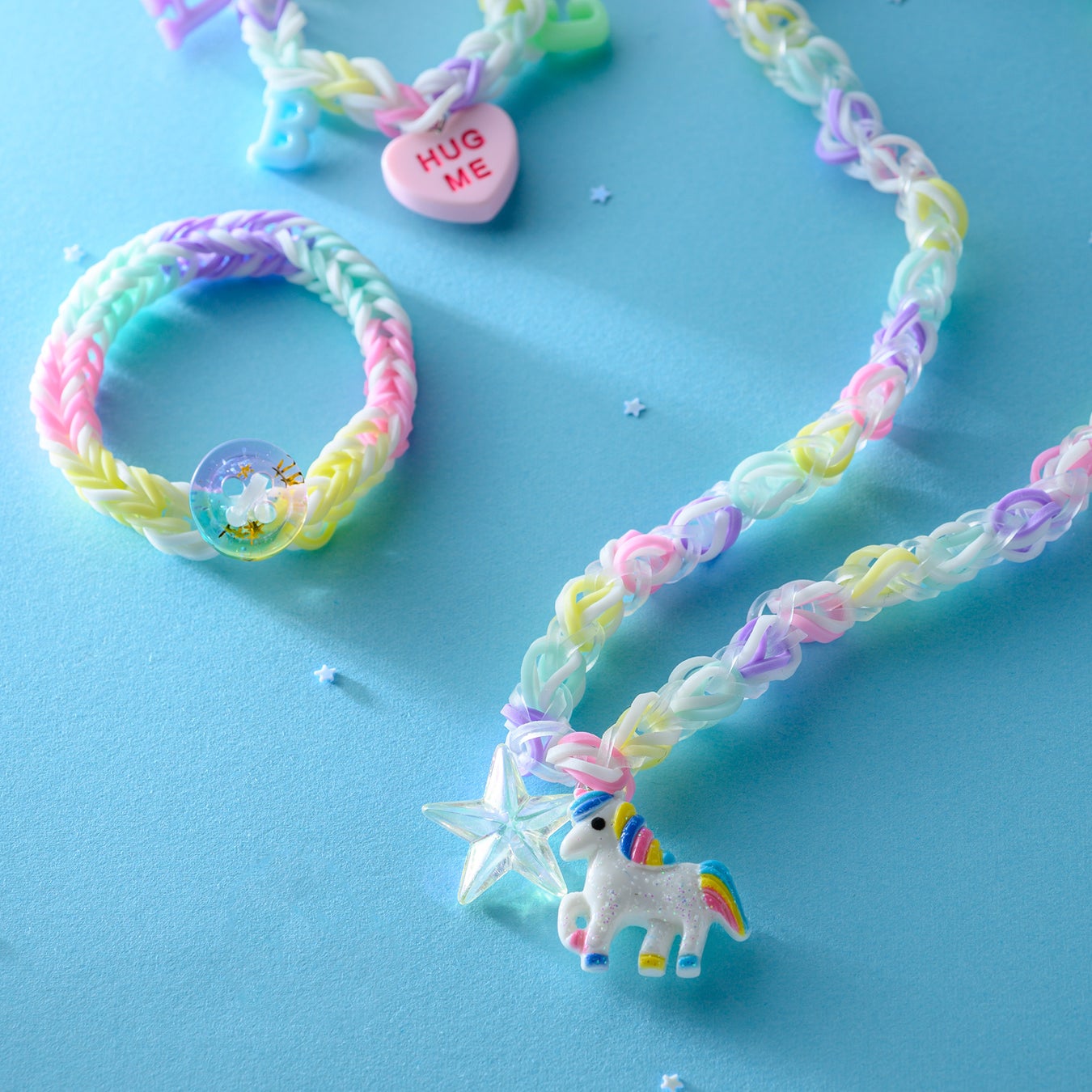 【手づくりキット】動画つきで簡単にゆめかわカラーのアクセサリーがつくれる『レインボールーム 輪ゴムでつくる ゆめいろアクセサリーキット』が発売中。