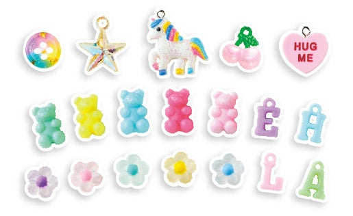 ユニコーン、星、にじいろボタン、ハートチャーム、くまちゃんチャーム……ゆめかわアクセサリーに欠かせないアレンジパーツもすべて入っています。