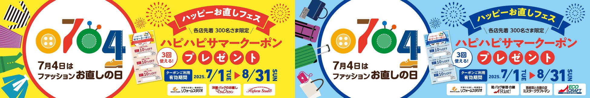 洋服・バッグのお直しを行う「マジックミシン」、靴・バッグの修理を行う「リアット!」など、全国に668店舗(2025年2月末現在)を展開するイオングループのリフォームスタジオ株式会社(以下、当社。本社:千葉県千葉市美浜区、代表取締役社長:齊藤岳彦)は、7月4日「ファッションお直しの日」(一般社団法人日本記念日協会認定)を記念して、「ハッピーお直しフェス」を開催いたします。