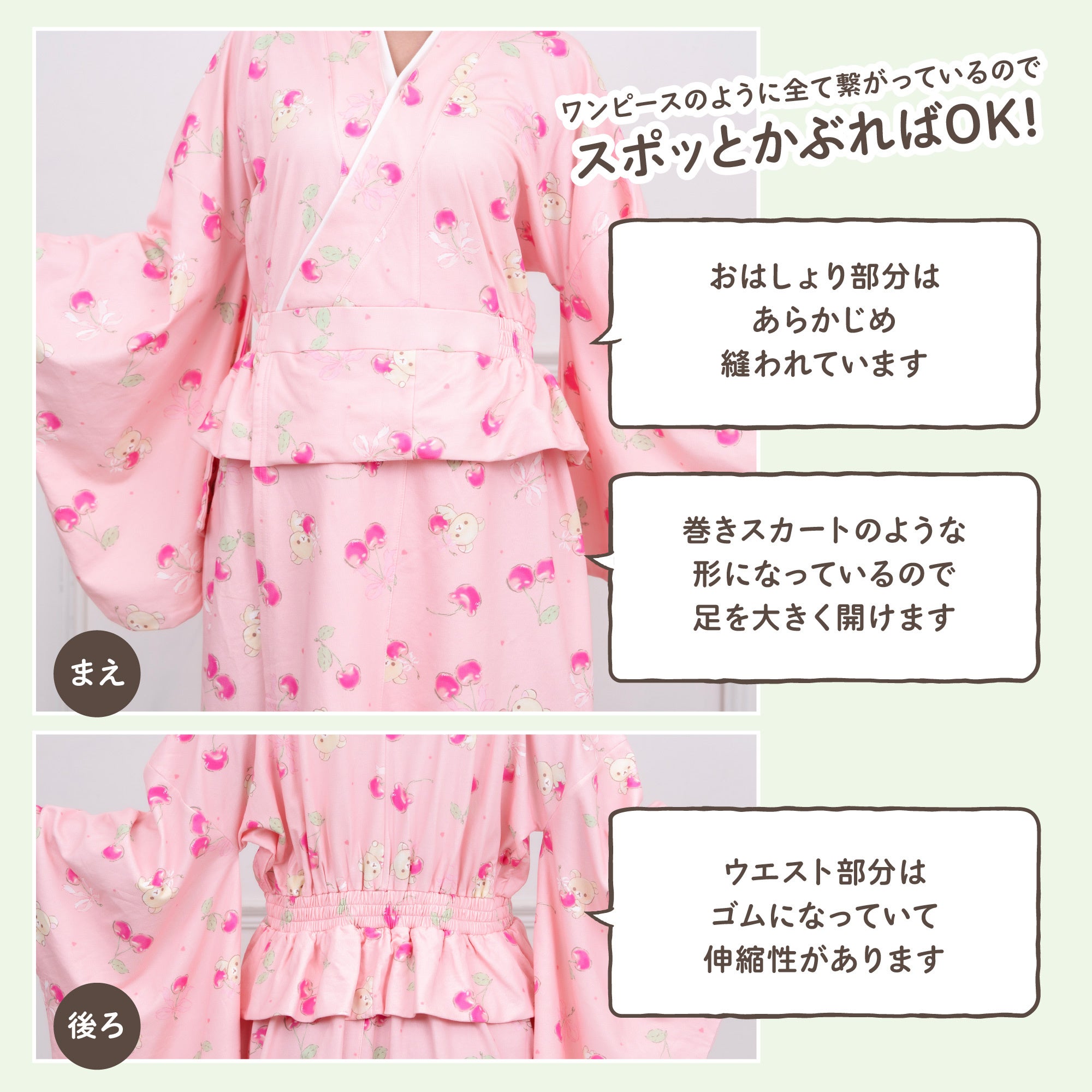 柔らかいスウェット素材と、上からスポッと着ることができるワンピース仕様で気軽に和服を楽します!