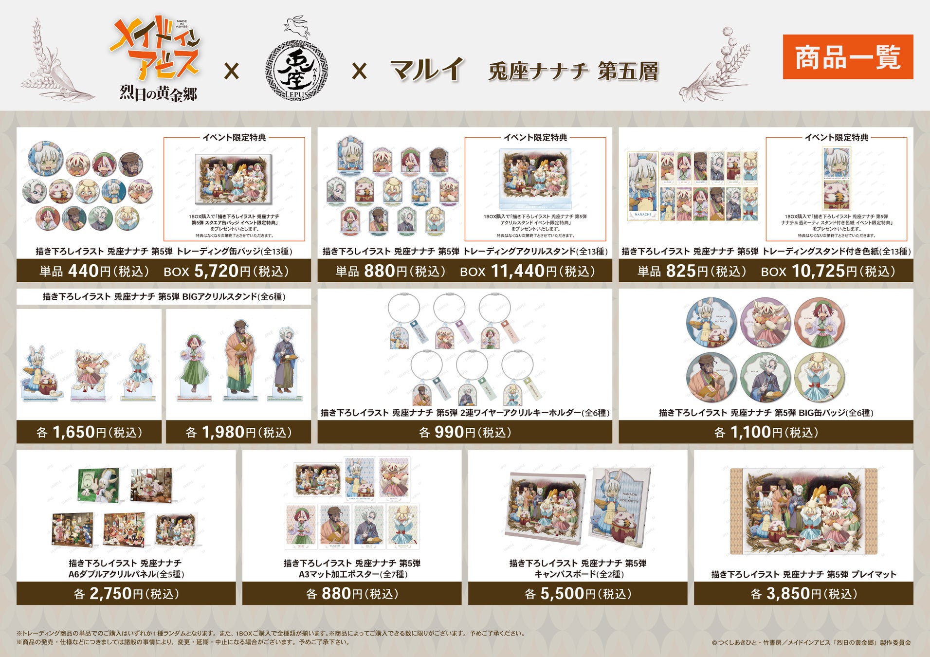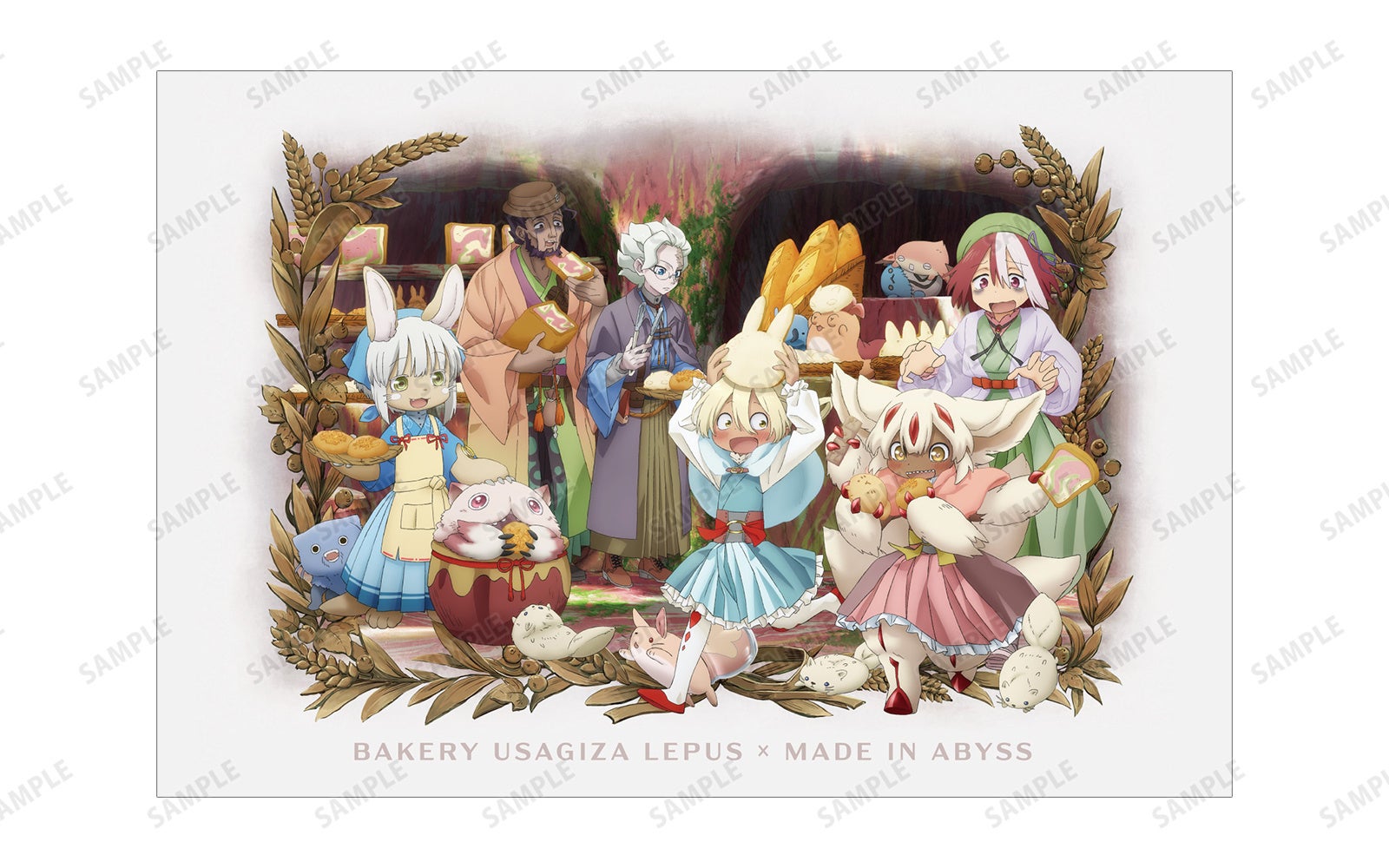 「ベーカリー兎座LEPUS」ではイベント限定コラボパンの販売を行い、「新宿マルイ メン」ではアビスの深界にある「ベーカリー兎座LEPUS」でコラボパン作りを楽しんでいる「ナナチ」をはじめとする、作品登場キャラクター達の描き下ろしイラストグッズを多数ご用意しております。期間中、描き下ろしイラストを使用した商品の先行販売を始め、イベント限定購入特典の配布など盛りだくさんのイベントとなっております。