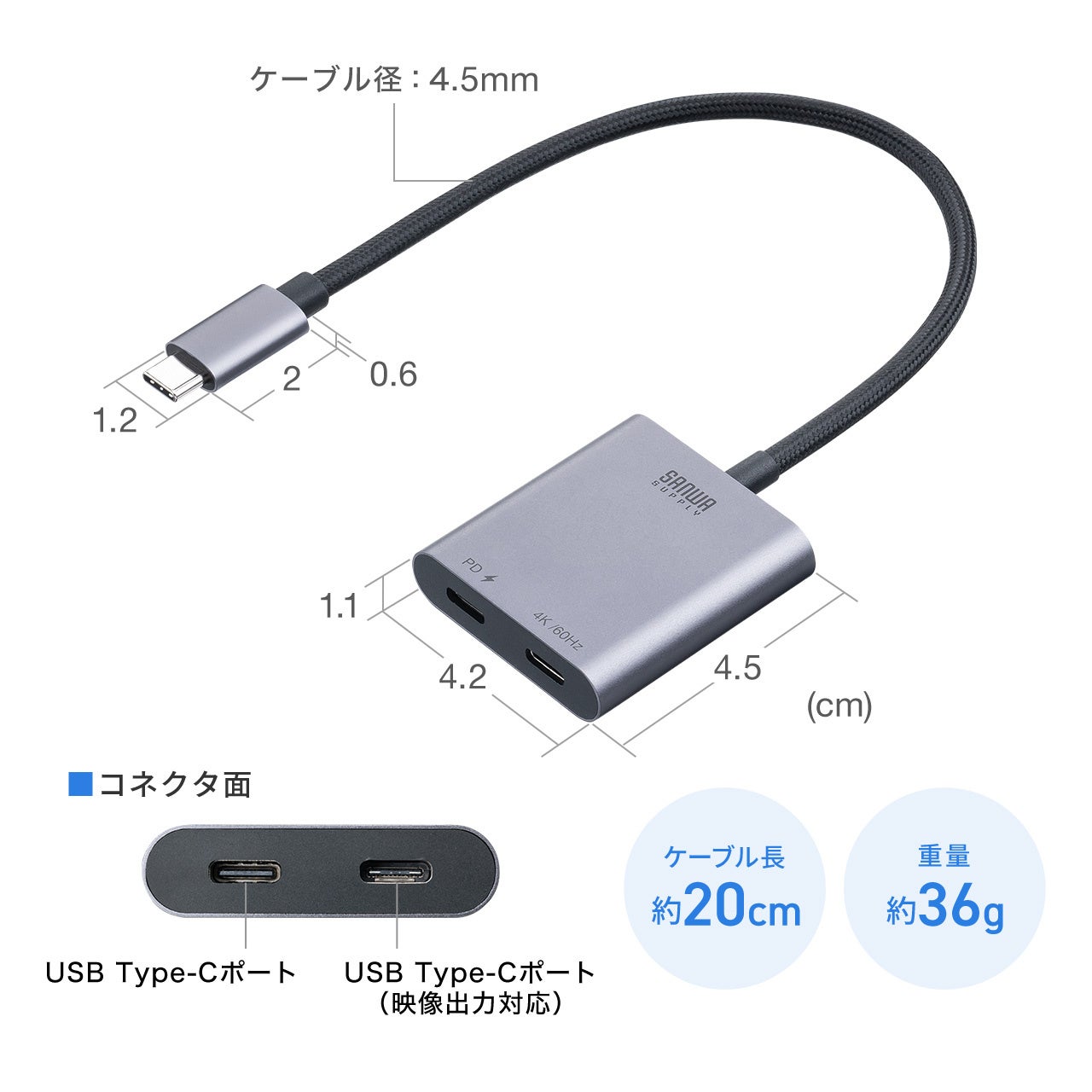 ●スマホ、パソコンのType-Cポートを映像出力用と、USB PD充電用の2つのType-Cポートに分岐させるアダプターです。