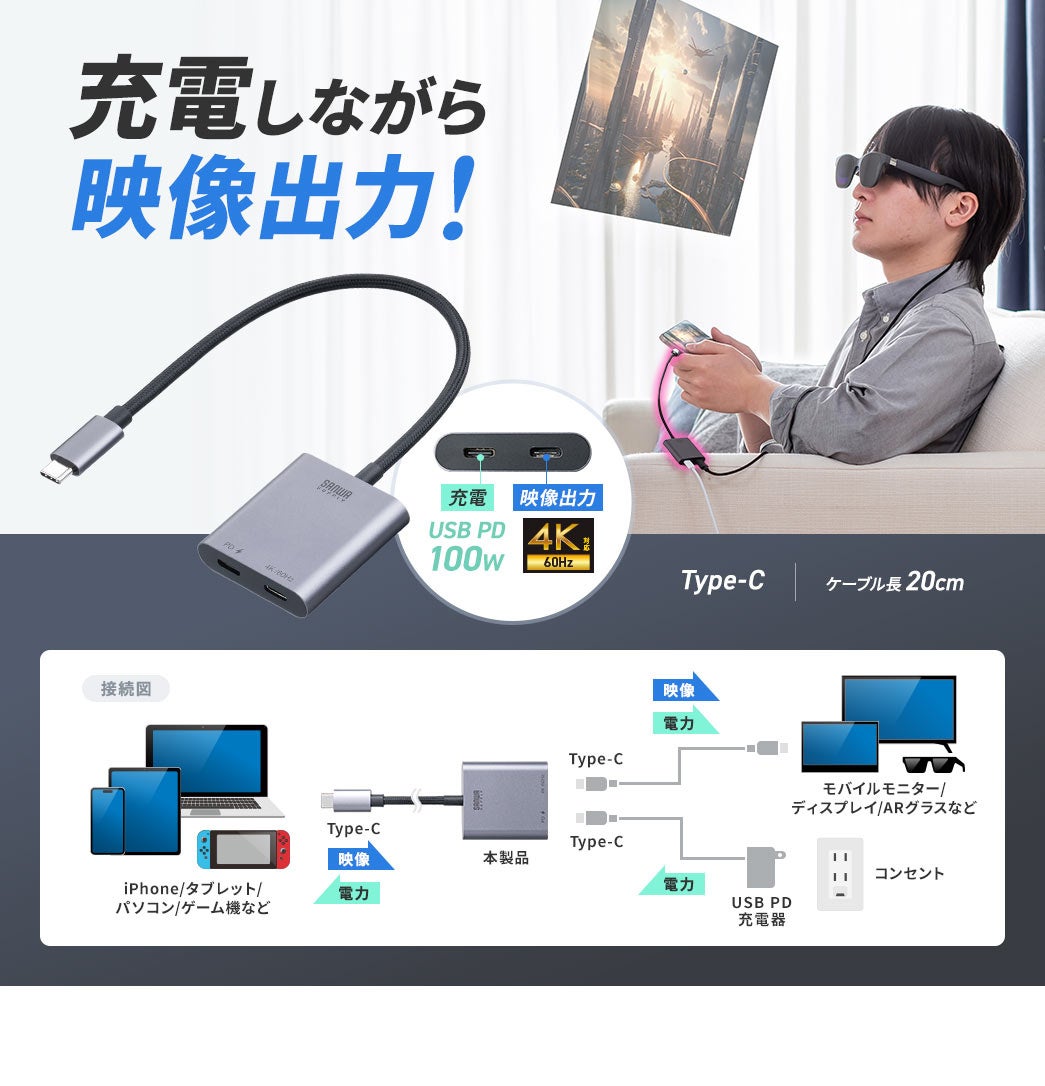 サンワサプライ株式会社(本社:岡山市北区田町1-10-1、 代表取締役社長 山田 和範)が運営している直販サイト『サンワダイレクト』では、USB Type-C接続でスマホを充電しながら、Type-C接続のARグラスやモバイルモニターに映像出力することができるType-C拡張アダプタ「500-KC047」を発売しました。