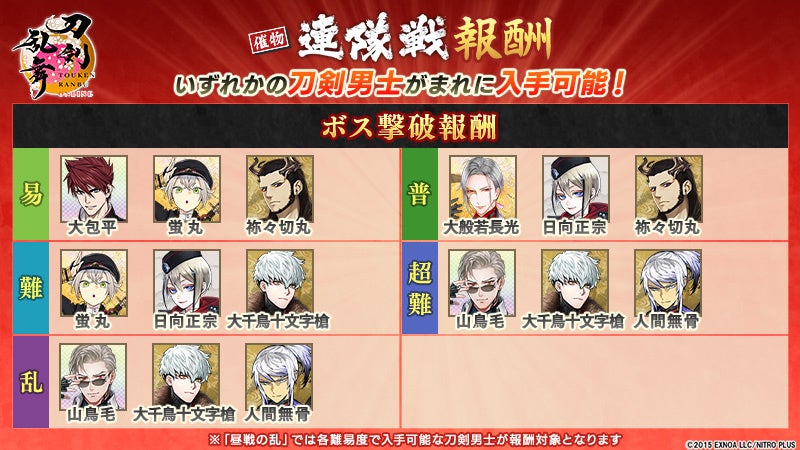 各難易度の合戦場のボスを撃破すると、まれに下記の刀剣男士も入手できます。