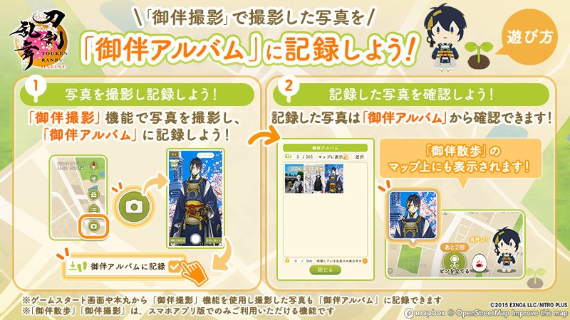 「御伴撮影」で撮影した写真を「御伴アルバム」に記録すると、「御伴アルバム」からいつでも確認できるほか、「御伴散歩」のマップ上にも表示されます。
