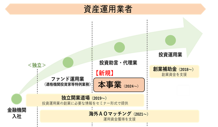 投資運用業を営むために必要なライセンスの取得には、高い人的・財務的要件等が求められます。投資助言・代理業等で投資運用経験を積み、投資運用業にステップアップしていく例もあることから、本事業を通じて、投資運用業者の裾野を拡大して参ります。