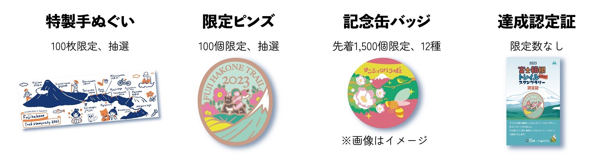 スタンプを獲得すると記念缶バッジがもらえます。また、スタンプラリーを達成すると達成認定証がもらえるほか、抽選で当たる特製手ぬぐいや特製ピンズに応募できます。