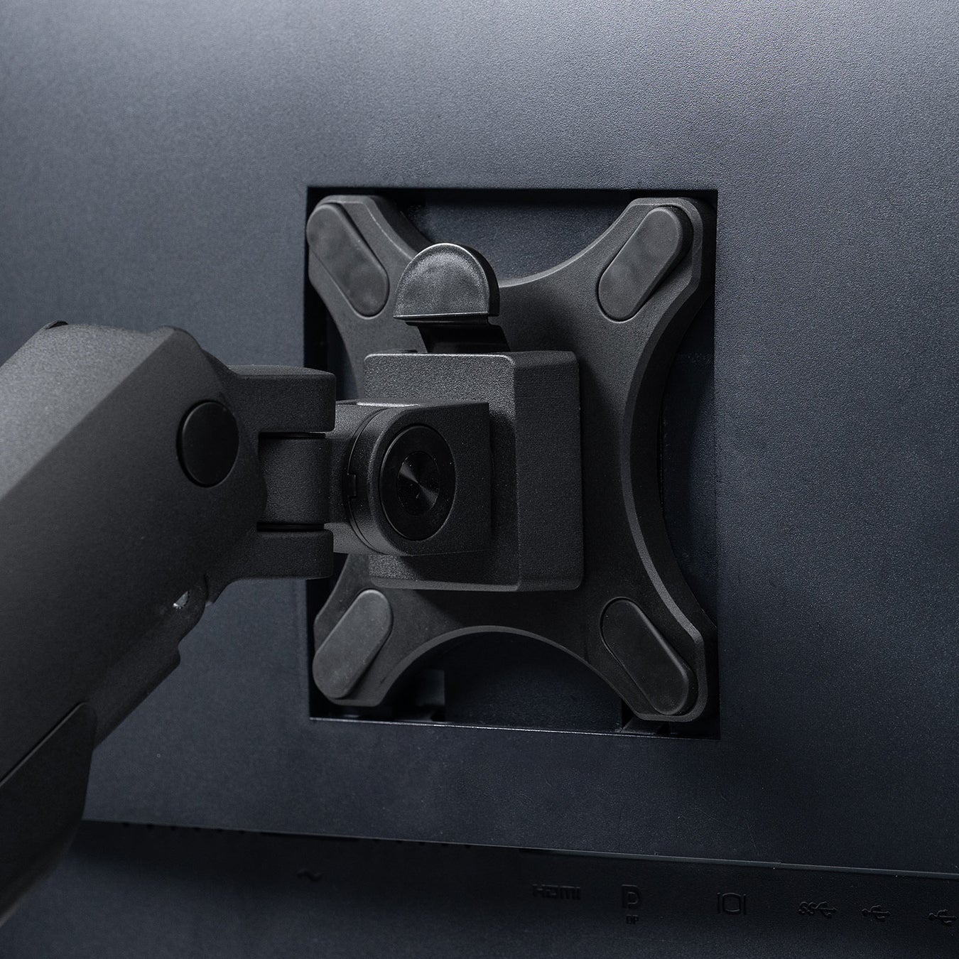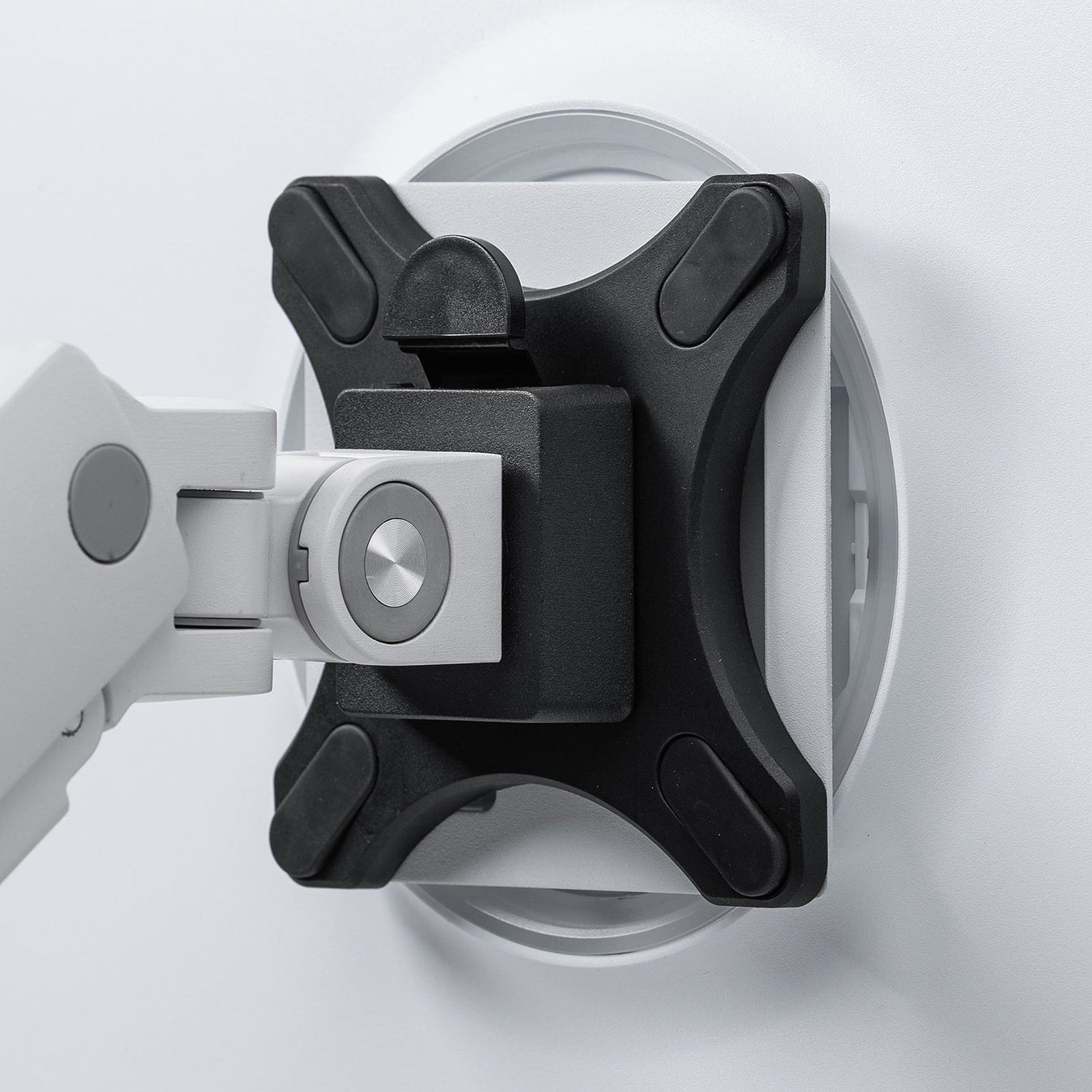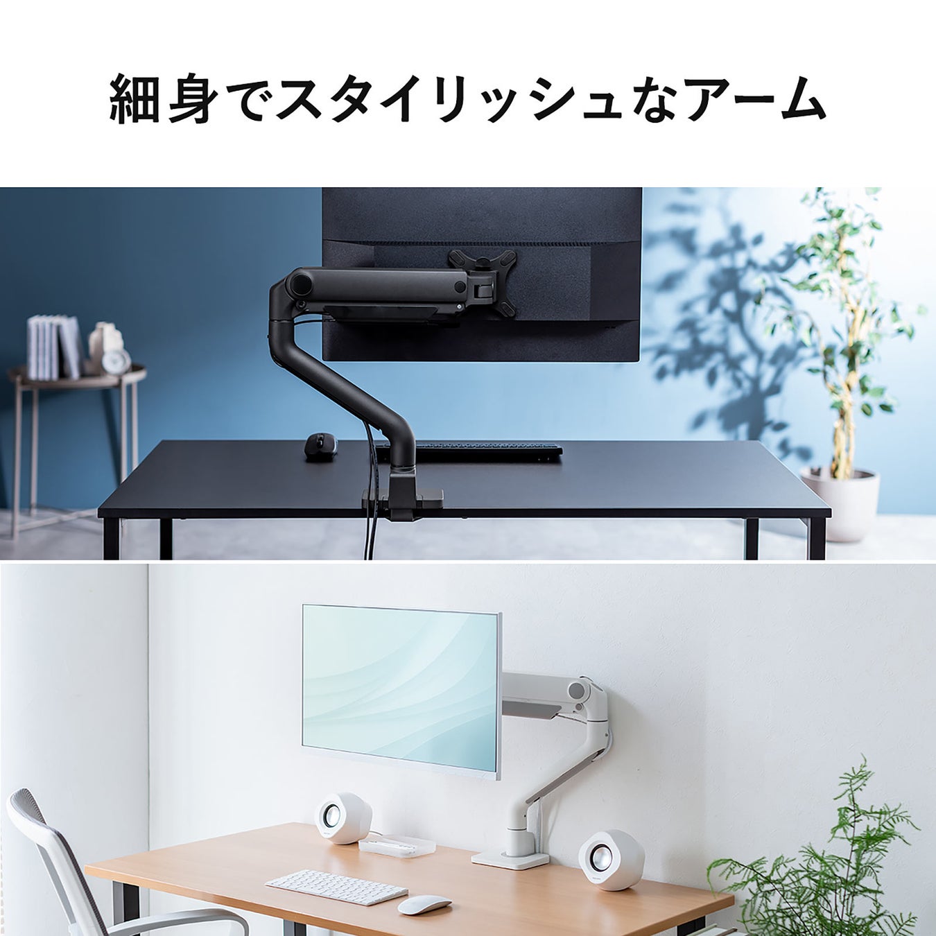 このモニターアームは、ガススプリング内蔵の4軸タイプで、モニターの高さをスムーズに調整できます。目線に合わせて簡単に上下調整が可能なため、作業の疲れを軽減し、より快適な作業環境を提供します。デスクワークをもっと快適にしたい方におすすめです。