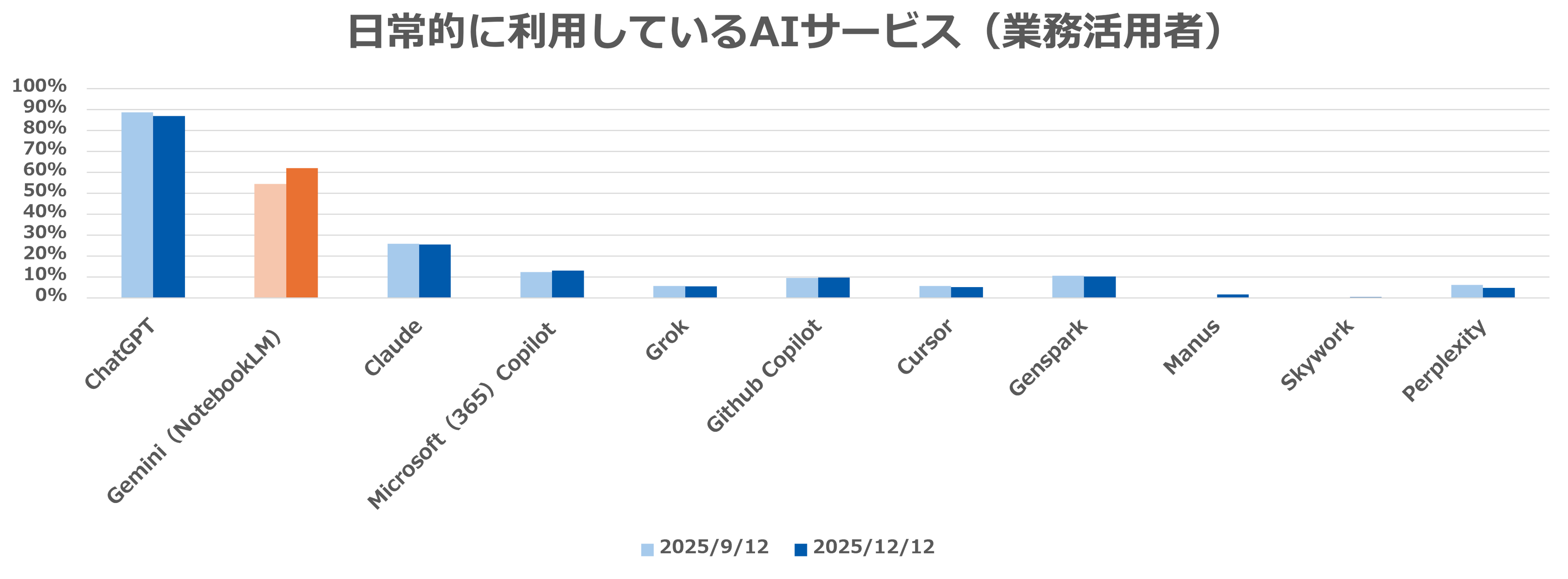 ・ 特にGemini(NotebookLM)の活用率が大きく伸びていることから、「nanobanana」や「NotebookLM」などの画像生成AIの社内浸透が進んでいると考えられます。
