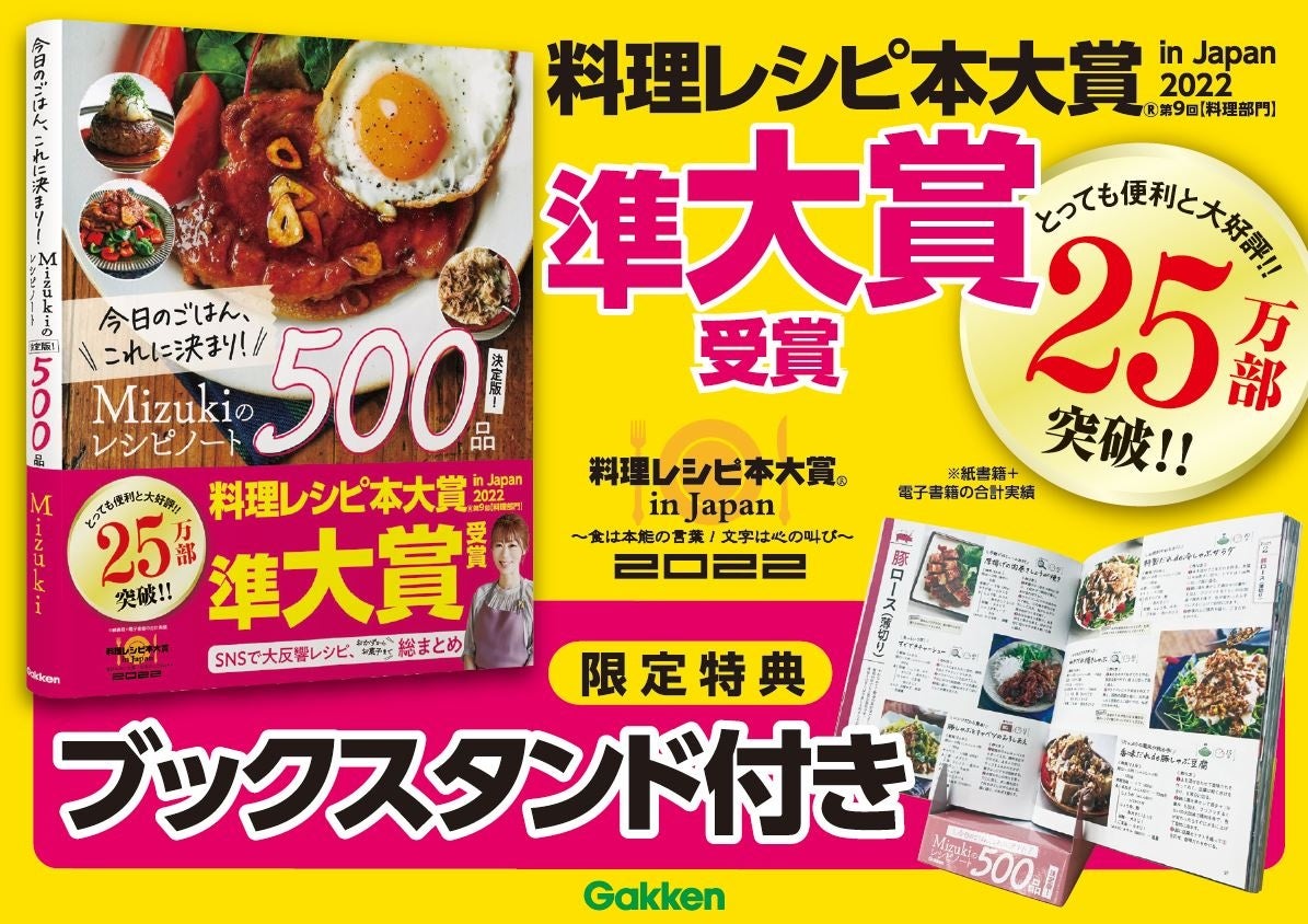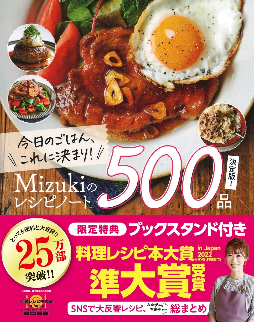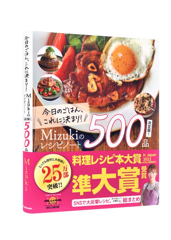 『今日のごはん、これに決まり!Mizukiのレシピノート決定版!500品』(以下:『Mizukiのレシピノート』)は、発売わずか2か月で発行部数10万部を突破し、今年の4月には累計25万部(紙+電子書籍にて)を突破。さらに、「2022年度 第9回料理レシピ本大賞 in Japan」では料理部門 準大賞を受賞、著者・MizukiのInstagramフォロワーも110万人を突破し、多くの方から支持を得ています。
