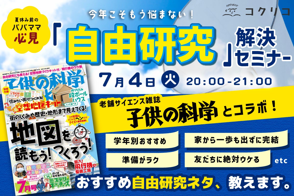 夏休みの宿題の中でも特にハードルが高いと言われる、自由研究。「今年こそ悩みたくない……」そんな保護者のかたに朗報! 講談社コクリコは2023年7月4日(火)、大正13年に創刊された老舗サイエンス雑誌『子供の科学』編集部とコラボして、保護者のかたに向けたオンラインイベント「自由研究解決セミナー」を開催します。