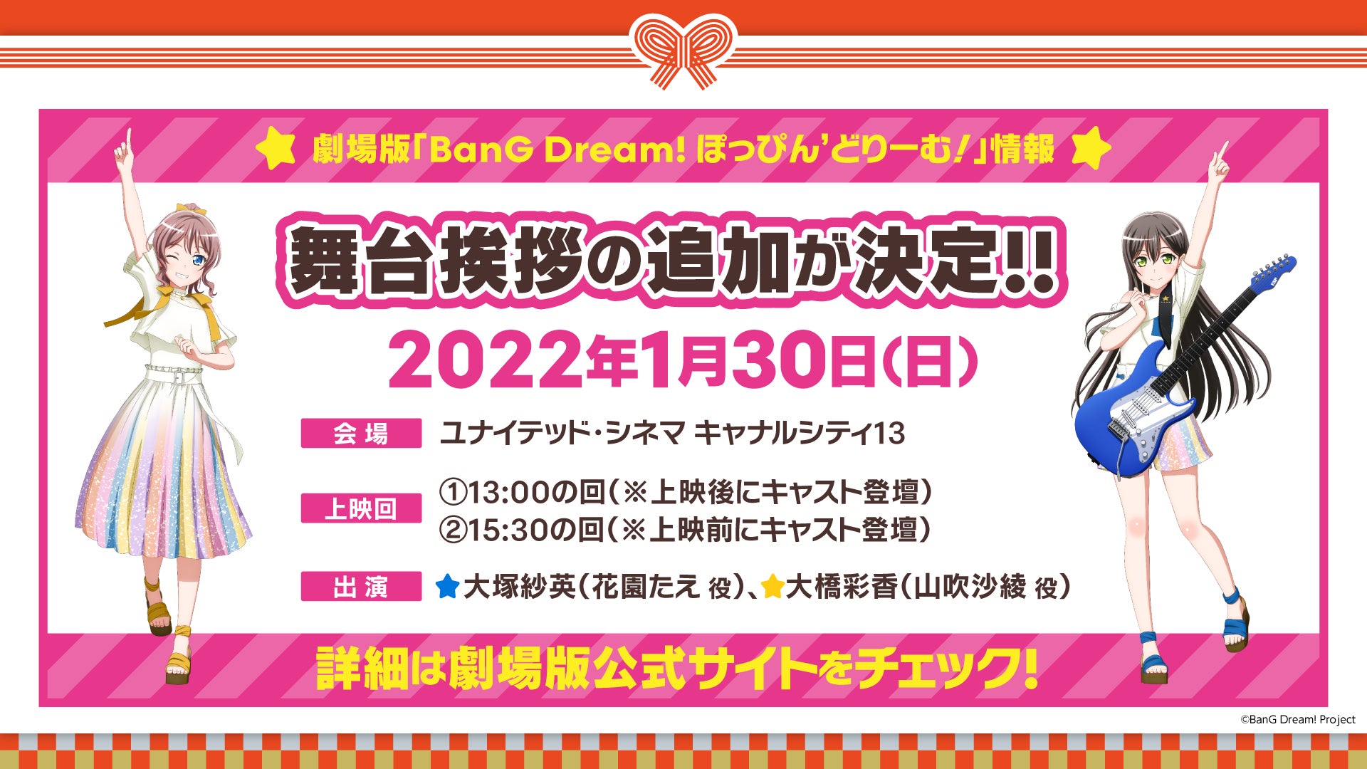 株式会社ブシロード(本社:東京都中野区 代表取締役社長:橋本義賢、以下、ブシロード)は、1月10日(月・祝)に発表した劇場版「BanG Dream! ぽっぴん’どりーむ!」に関する新情報をお知らせいたします。