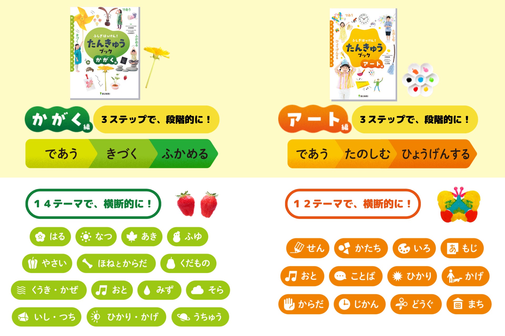 かがく編では14テーマ・アート編では12テーマと多岐に渡る分野を網羅しつつ、それぞれのテーマを3ステップ式で深めることができるので、お子さまの好奇心・探究心をのばすことができます。