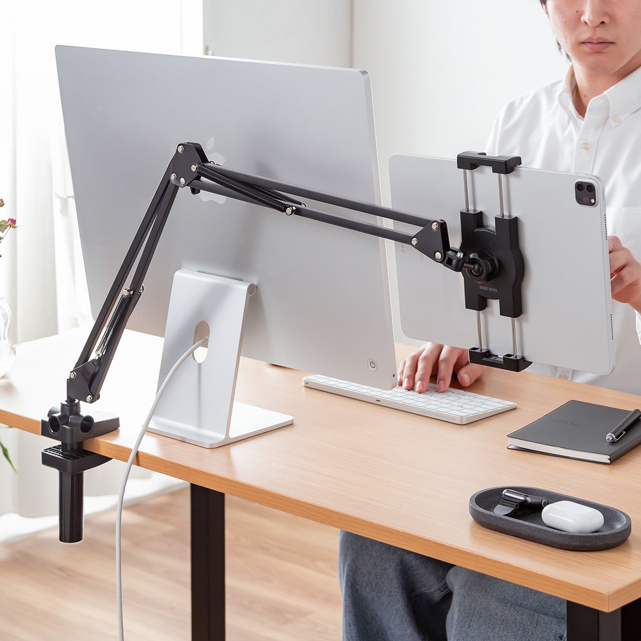 本製品は、縦向き、横向きどちらでも取付可能なタブレット・スマートフォン用アームスタンドです。