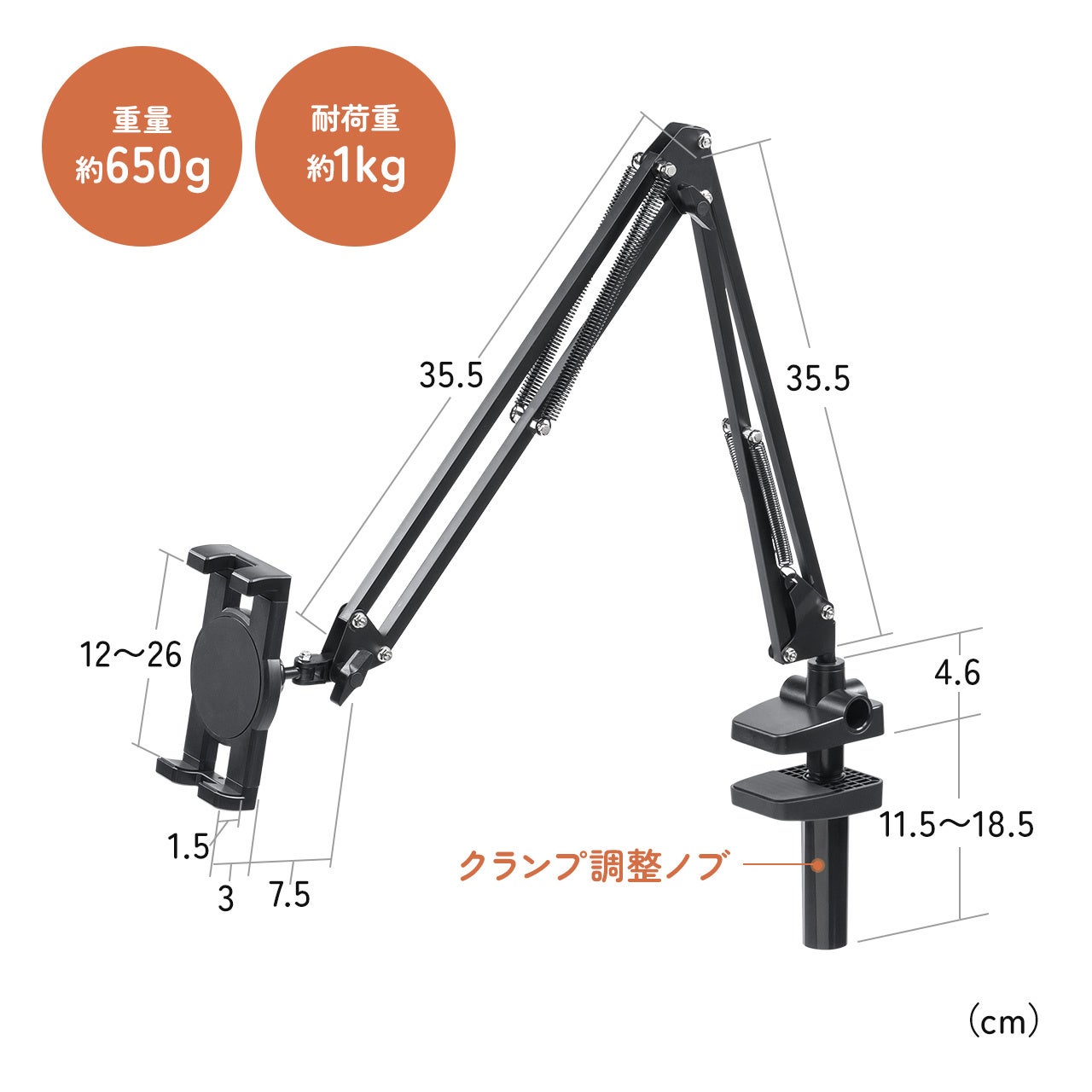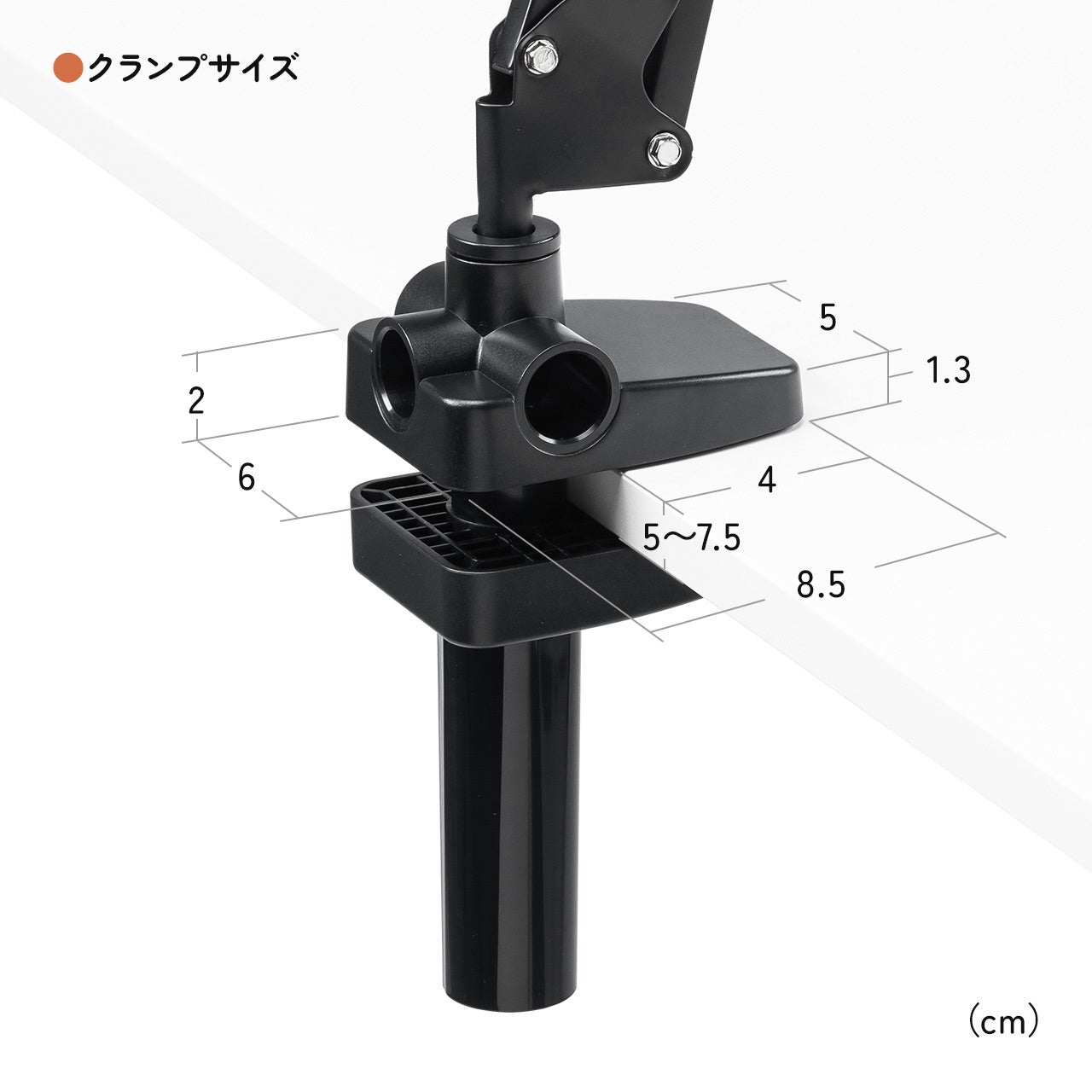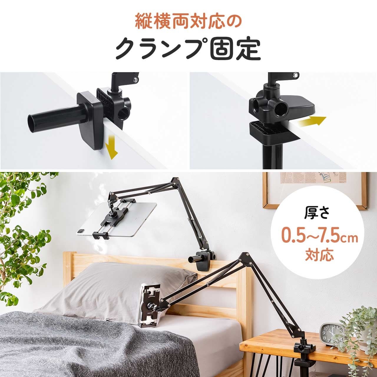 4~12.9インチまでに対応し、挟み込むことで固定できます。クランプ部は、縦・横挟みに対応し、厚さ0.5~7.5cmまで対応します。