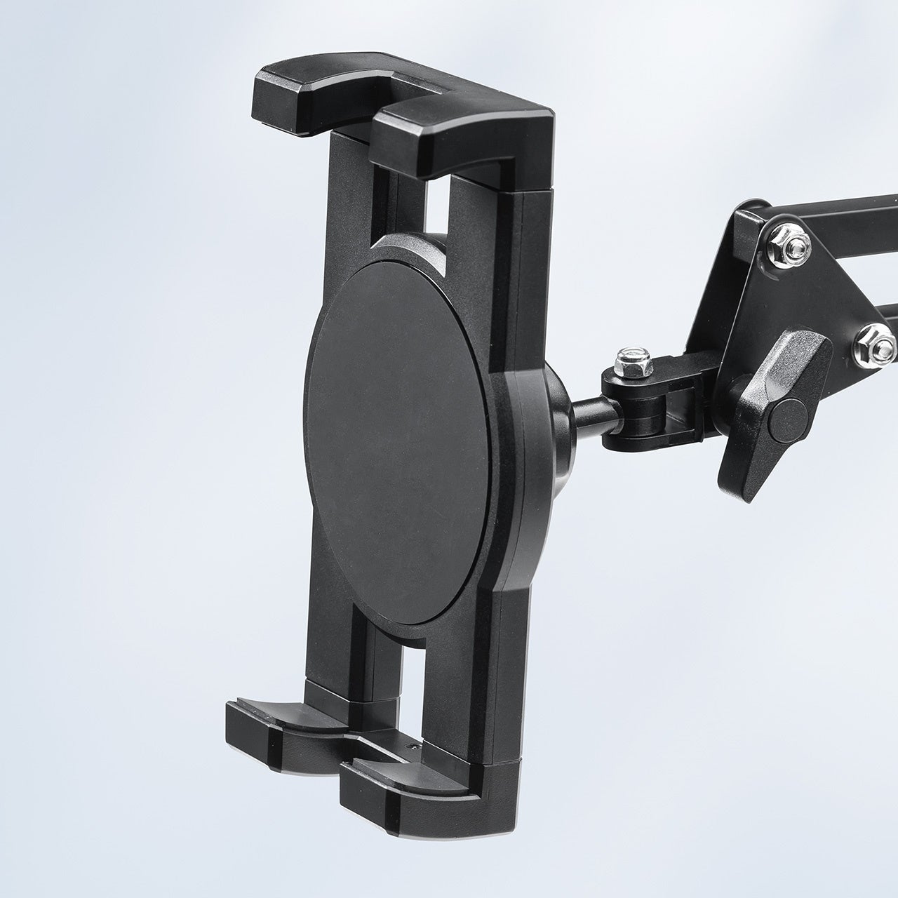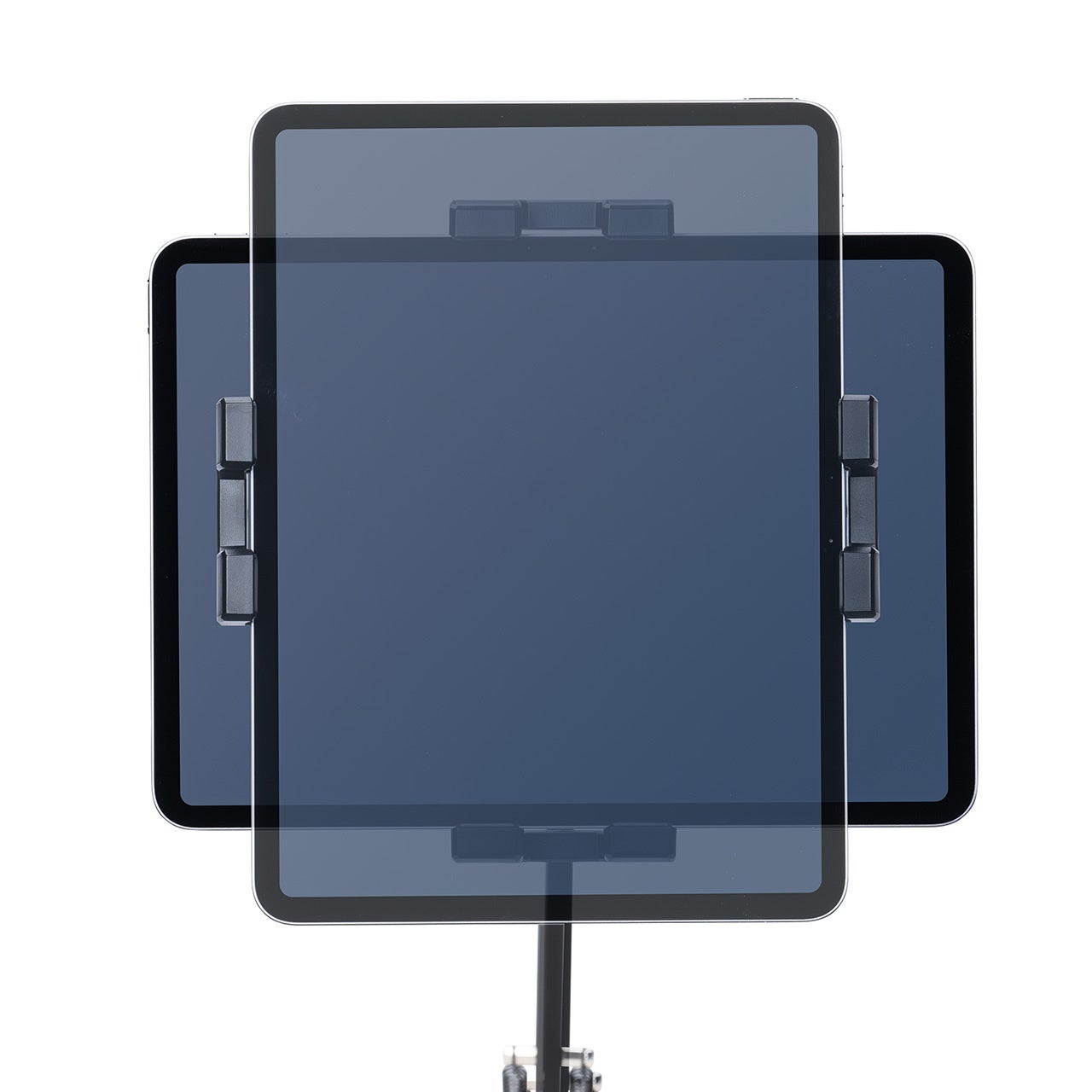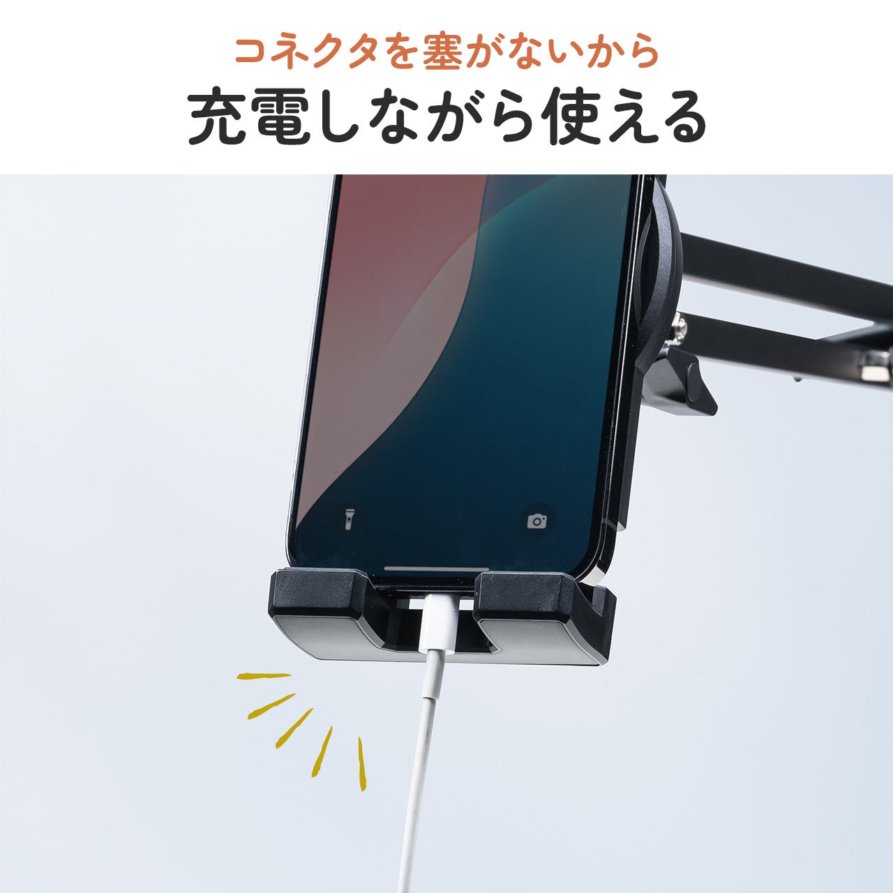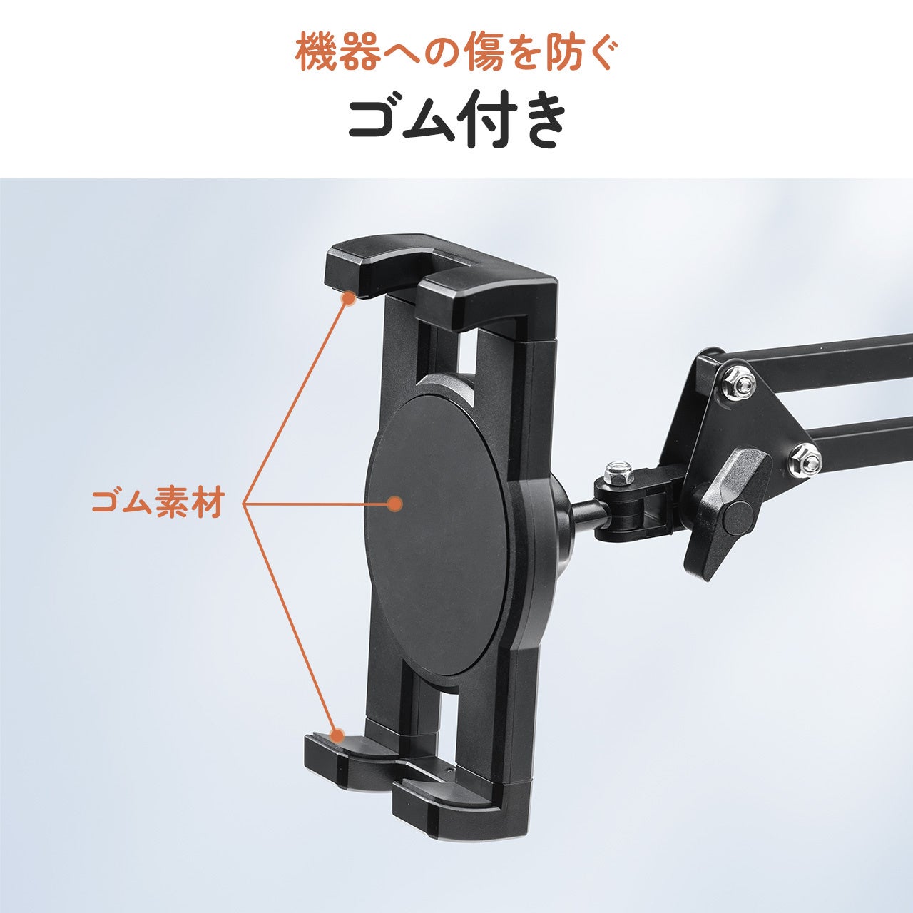 4~12.9インチまでに対応し、挟み込むことで固定できます。クランプ部は、縦・横挟みに対応し、厚さ0.5~7.5cmまで対応します。