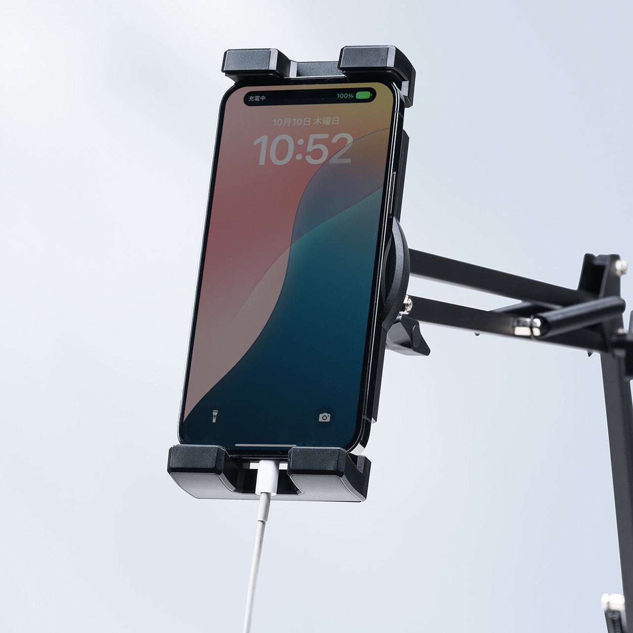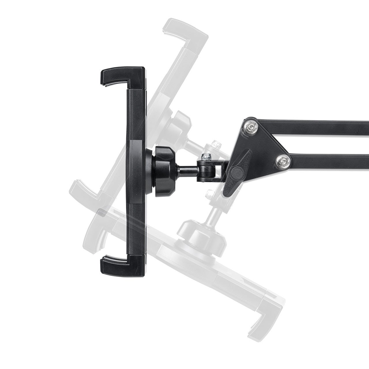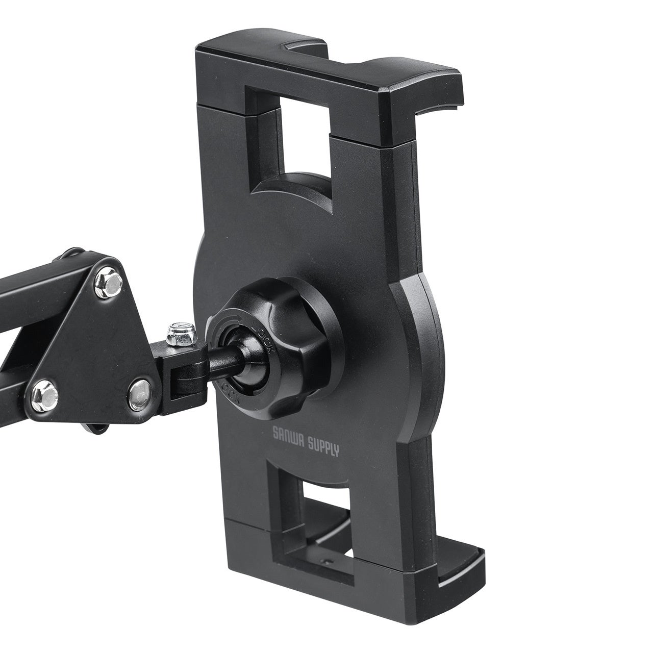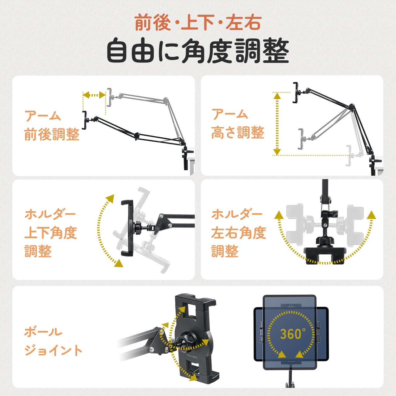 ホルダー部のボールジョイント、アームの4つの関節、アーム根元の回転でホルダーの位置や向きを自在に調節できます。