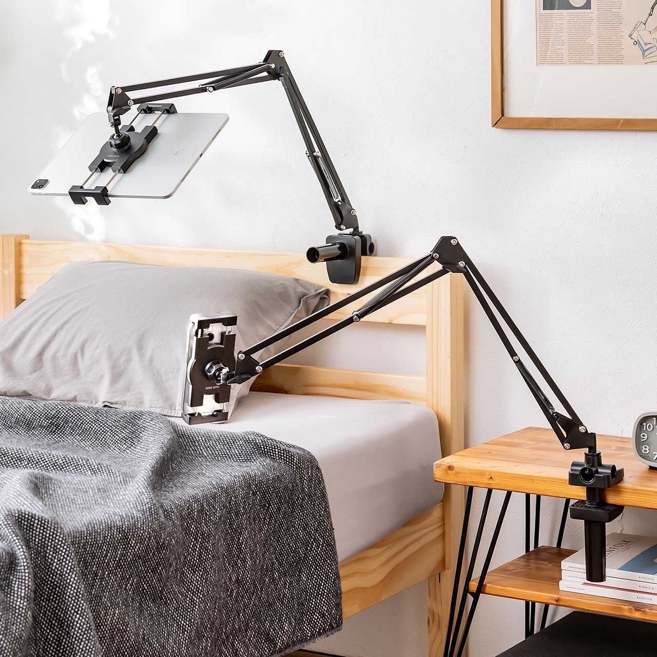 タブレットアームスタンド 寝ながら アーム スマホアーム クランプ固定式 3関節 ベッドサイド取付可能 寝ながら 360度回転