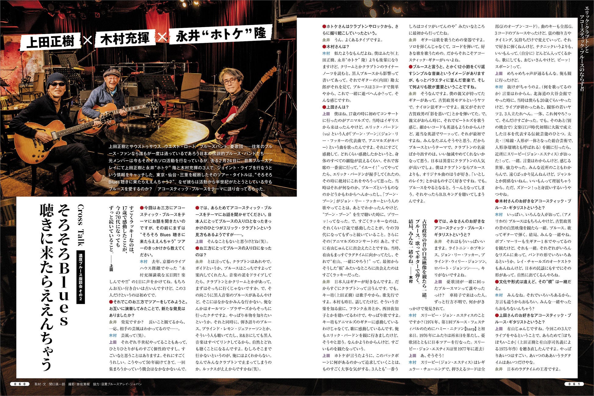 また、同特集では、1970年代から活躍する日本を代表するブルースマン……内田勘太郎(憂歌団)、木村充揮(憂歌団)、上田正樹(サウストゥサウス)、永井“ホトケ”隆(ウエスト・ロード・ブルース・バンド)、吾妻光良(The Swinging Boppers)、小出斉(ローラーコースター)といたレジェンドが、各々のクラプトン感、今だからこそ後世に伝えたいブルースへの熱い想いを語っています。クラプトン好きの人もそうでない人も、本特集をきっかけにもう一度ブルースと向き合ってみてはいかがでしょうか。