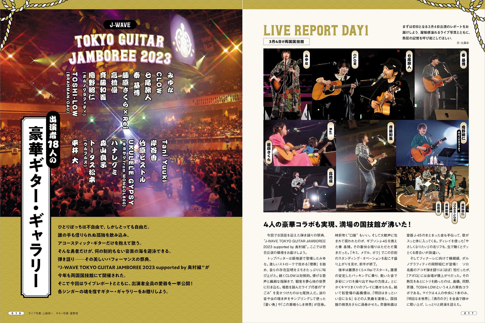 好評の付録小冊子『AGM SONB BOOK Vol.10』は、2023年3月4日、3月5日に両国国技館で行なわれた『J-WAVE TOKYO GUITAR JAMBOREE 2023 supported by奥村組』とのコラボ企画。斉藤和義の新曲「明日大好きなロックンロールバンドがこの街にやってくるんだ」、珍しくソロの弾き語りで登場した岡野昭仁(ポルノグラフィティ)による「アポロ」、懐かしさ満載で会場を大いに盛り上げた岸谷 香の「Diamonds <ダイアモンド>」など、イベントのハイライトとなった12曲を厳選し、アコギ1本で歌えるように歌詞とコード譜をダイアグラム付きで掲載。出演者18名による豪華ギター・ジャラリーも必見です。