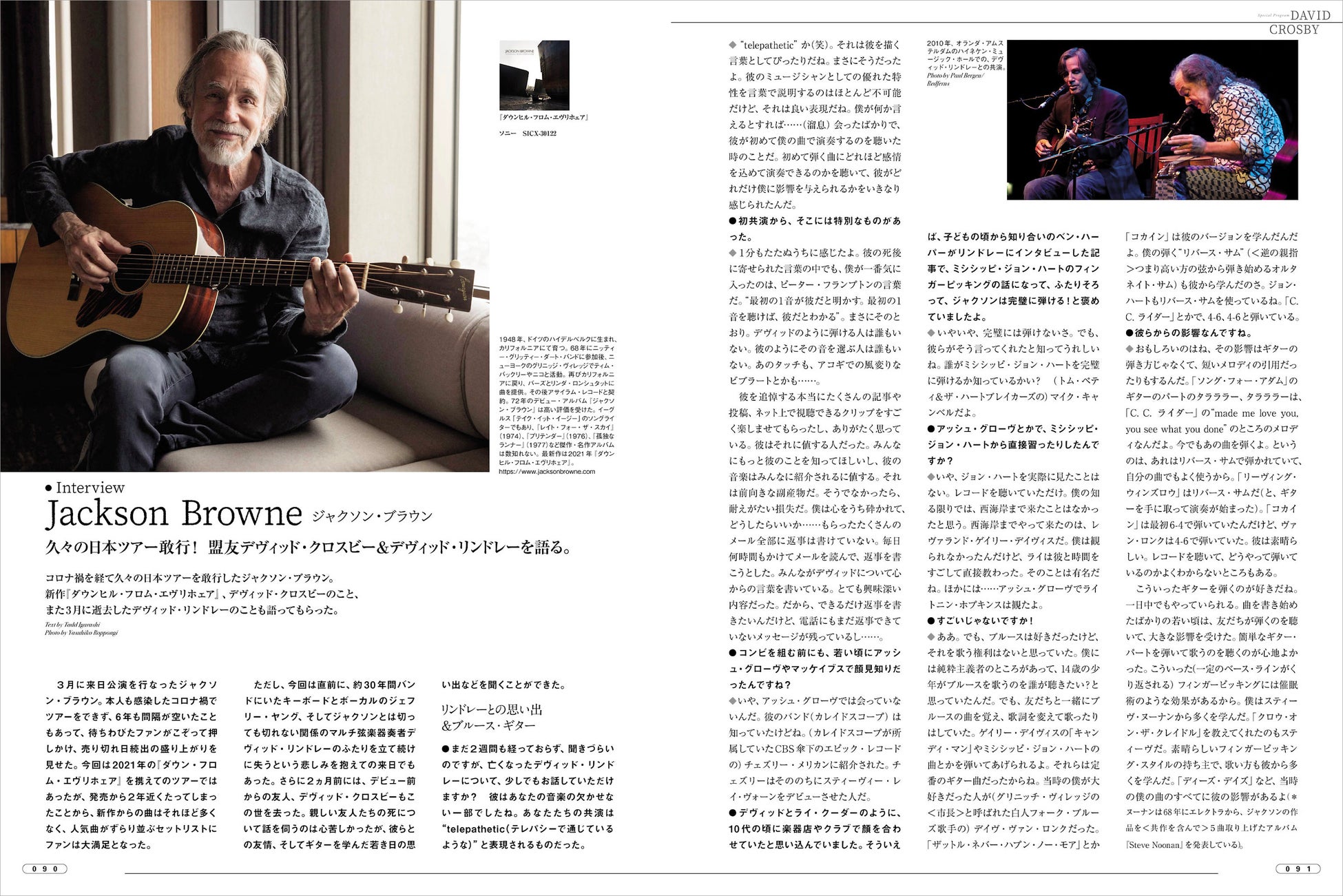 第2特集では、2013年1月19日に逝去したウエストコーストのアコースティック・ギター・ゴッド/デヴィッド・クロスビーの追悼記事を掲載。近年の作品は特に、シンガーソングライター/ギタリストのベッカ・スティーヴンス、スナーキー・パピーのマルチ・インストゥルメンタリストのマイケル・リーグ、そしてシンガーソングライター/キーボード・プレイヤーのミシェル・ウィリスからなる”Lighthouse Band"という新進気鋭のミュージシャンとコラボするなど、現役ミュージシャンとして活躍していただけに、その訃報に驚きを隠せなかった音楽ファンも多かったことでしょう。晩年の活動を語った貴重な本人インタビューのほか、1960年代後半からローレル・キャニオンの地で生活をともにした盟友ジャクソン・ブラウンの最新インタビューも。また、ジャクソンは、今年3月に亡くなった盟友デヴィッド・リンドレーとの思い出も存分に語ってくれています。