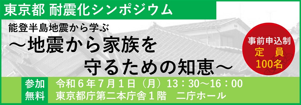 今回、能登半島地震から半年をむかえる7月1日に、都民一人ひとりに直下地震を想定していただき、建築物の耐震化の機運を醸成することを趣旨として、以下のとおり『東京都 耐震化シンポジウム』を開催します。