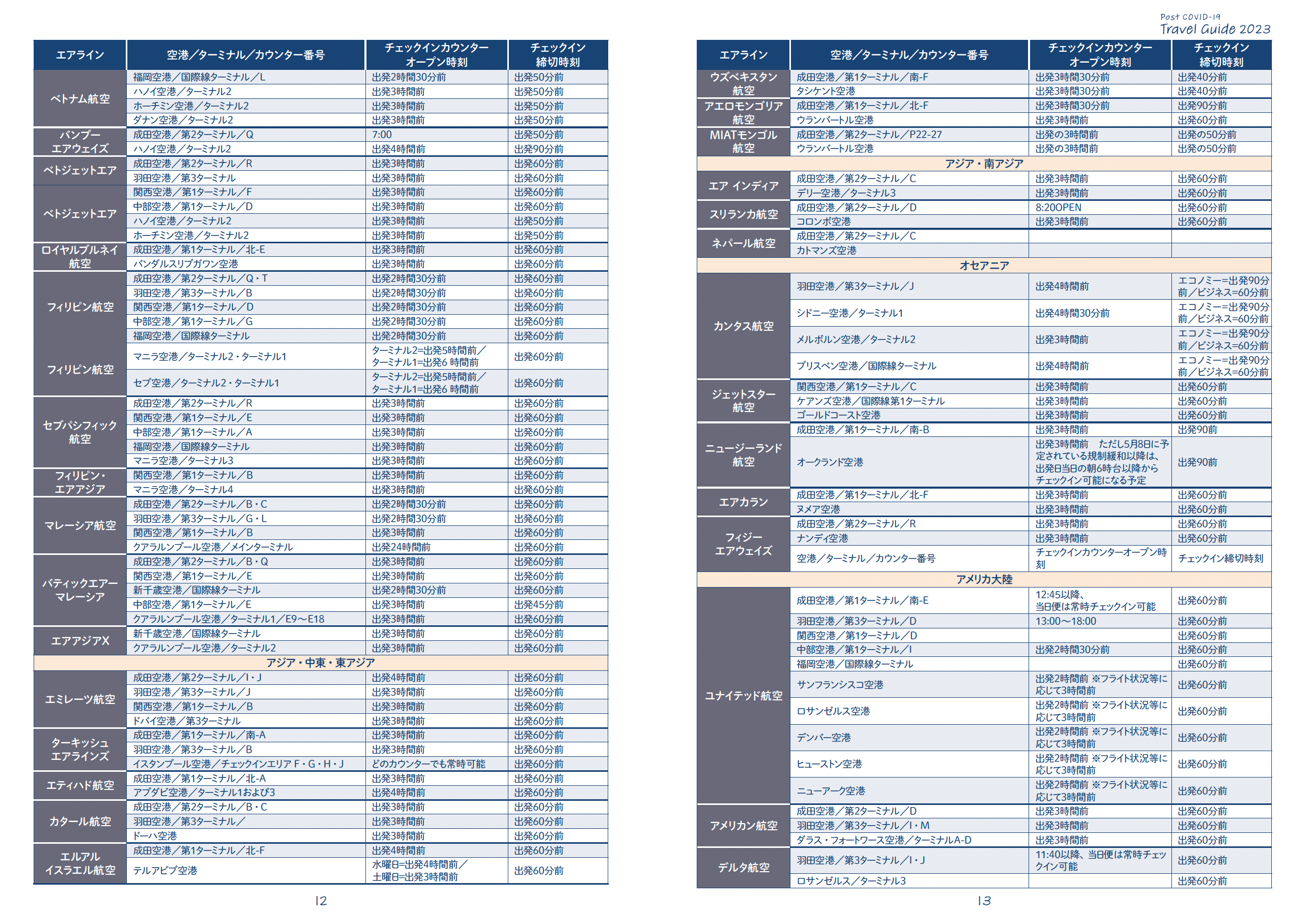日本に乗り入れている80社以上のエアラインの日本と海外空港におけるチェックインカウンターの営業開始時間と締切時間を徹底調査しました。エアラインによって異なるチェックインカウンターの営業時間をリスト化していますので、これを参照すれば、例えば旅の最終日、何時までに空港に行けばいいかという目安になり、帰国便出発までの時間を効率的に使うことができます。