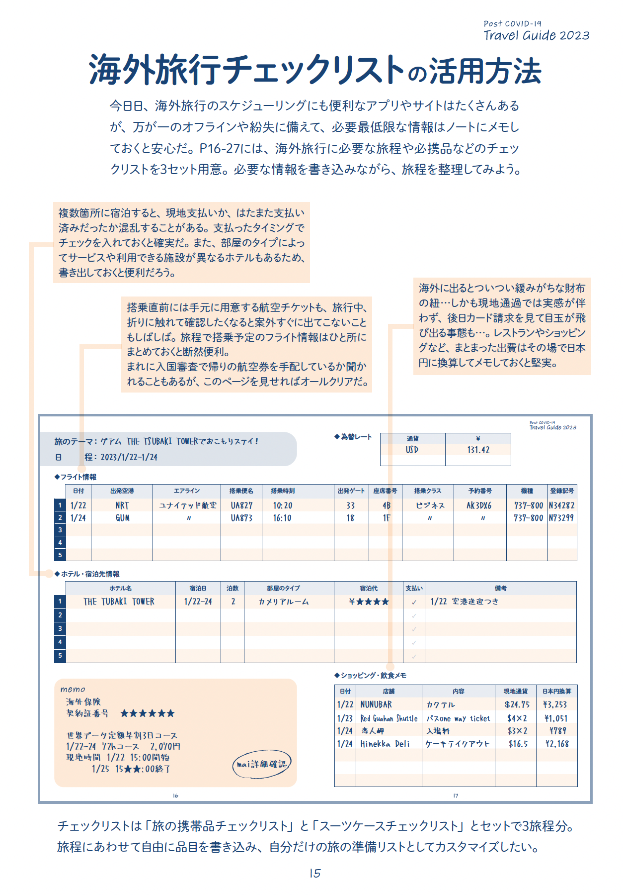 ずいぶんと緩和されてきていますが、コロナ禍の海外旅行ではワクチン接種証明書など、国によっては追加の書類が必要です。これら入国に必要な書類を「国別必要書類一覧」として地域ごとにまとめています。さらに通貨、コンセントの形状、旅の携行品チェックリストなどもあるため、出発直前の確認作業にも便利です。海外旅行ビギナーや、リハビリが必要な旅行者にも広く役立つ1冊です。