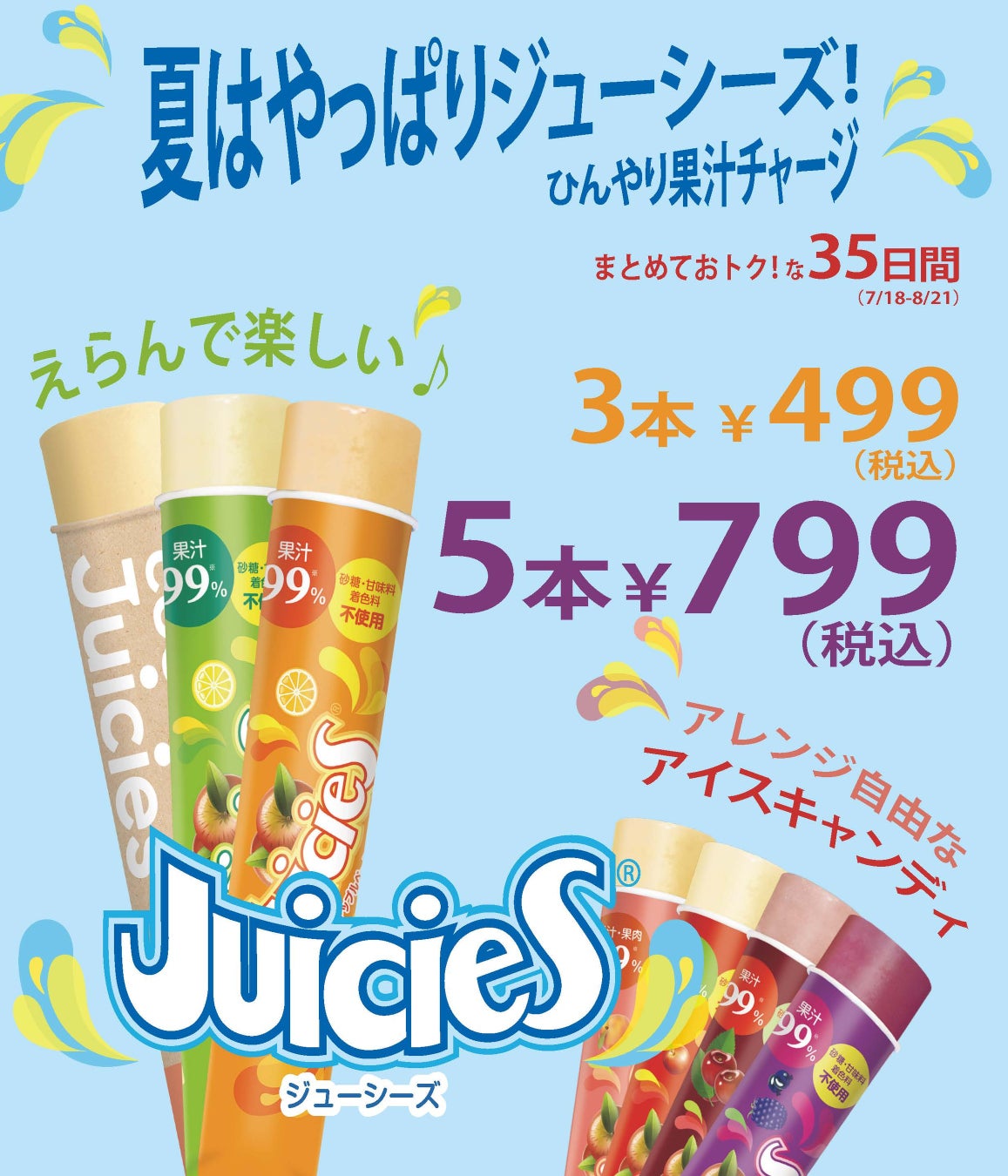 ◎ジューシーズ各種 通常189円 →上記期間よりどりキャンペーン価格 3本499円、5本799円