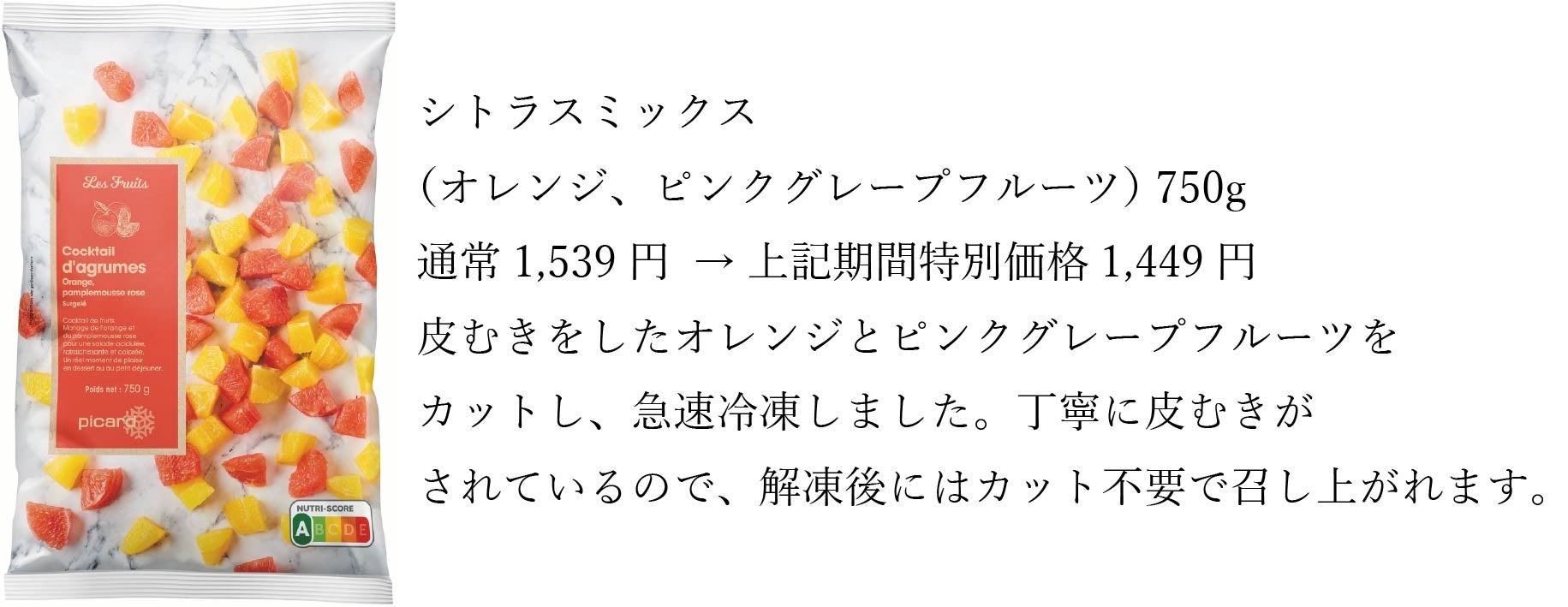 旬の美味しさを閉じ込めた冷たいデザートや、フルーツなど、多彩な商品を取り揃えました。お子さまから大人まで楽しめる、ひんやりおいしい商品で、夏の食卓をより豊かにします。ピカールのフルーツの多くは、自然のリズムに寄り添った露地栽培で育てられ旬のタイミングで収穫、素材の美味しさをそのまま閉じ込めているため、一年を通じて「今が食べ頃」の味わいをお楽しみいただけます。