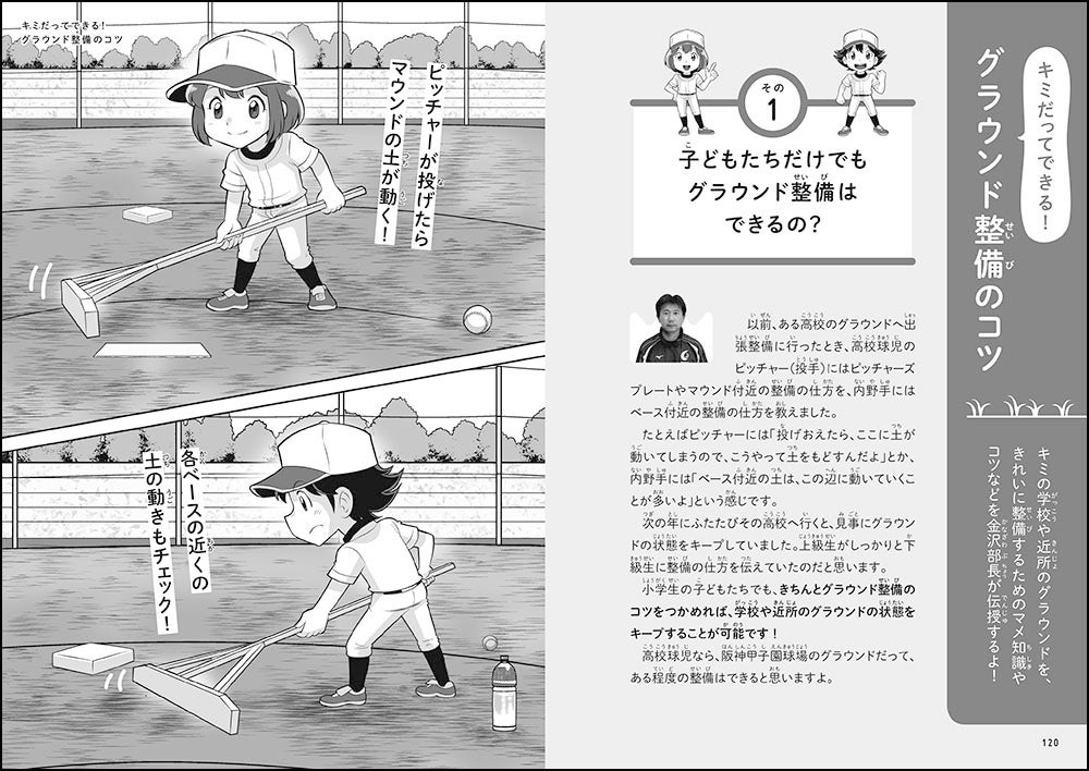 写真だけでなくイラストも交えて解説。巻末ページでは、子どもたちの身近にあるグラウンドの整備の仕方や、まっすぐラインを引くコツなどもイラスト付きで説明しています。