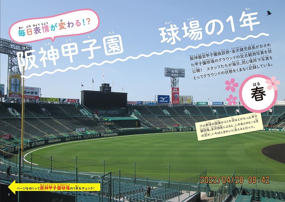 巻頭ページでは、阪神甲子園球場の1年間の様子をおさめた、阪神園芸秘蔵の写真資料を大公開。外野・内野グラウンドにおける作業風景のようすも写真つきで紹介しています。